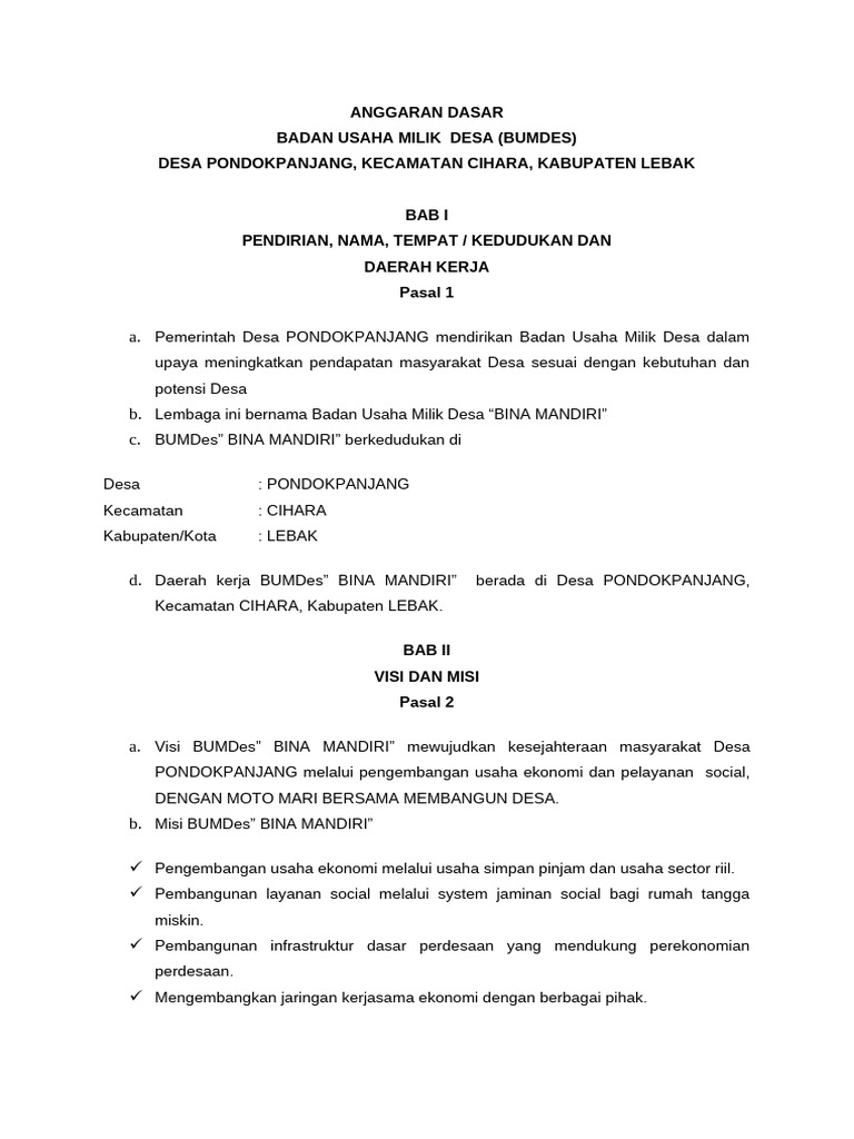 Contoh ad art bumdes. Semoga artikel ini bisa menjadi bahan acuan atau bahan perbandingan bagi kawan kawan pengurus bumdes. Anggaran dasar bumdes berisikan pasal pasal umum yang akan mengatur secara lengkap tentang bumdes. Contoh ad art bumdes salahsatu titik sulit pendirian bumdesa adalah menyusun anggaran dasar dan anggaran rumah tangga. Oleh karenanya diperlukan upaya sistematis untuk mendorong organisasi ini agar mampu mengelola aset ekonomi strategis di desa sekaligus mengembangkan jaringan ekonomi demi meningkatkan daya saing ekonomi perdesaan. Sesuai amanat pasal 213 undang undang nomor 32 tahun 2004 tentang pemerintahan daerah desa dapat mendirikan badan usaha milik desa bumdes guna mewadahi aktivitas perekonomian masyarakat desa. Organisasi ekonomi perdesaan menjadi bagian penting sekaligus masih menjadi titik lemah dalam rangka mendukung penguatan ekonomi perdesaan.