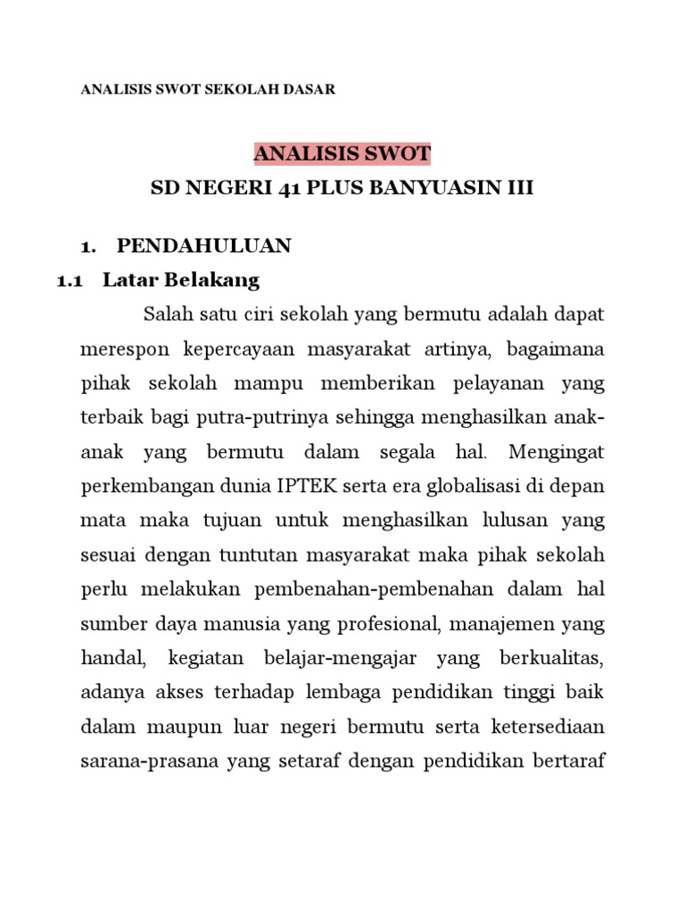 Contoh analisis swot dalam pendidikan. Analisis ini didasarkan pada logika yang dapat memaksimalkan kekuatan strenghts dan peluang opportunities akan tetapi secara bersamaan dapat meminimalkan kelemahan weakness dan ancaman threats. Ruang lingkup bisnis tunggal tersebut iyalah berupa domestik ataupun multinasional. Salah satu contoh untuk analisis ini berkaitan dengan perusahaan. Swot adalah merupakan sebuah pendekatan dan paling mutakhir dalam dunia menajemen. Jika analisis swot digunakan pada pendidikan maka dimungkinkan bagi sebuah sekolah untuk mendapatkan sebuah gambaran menyeluruh mengenai situasi sekolah itu sendiri baik dalam hubungannya dengan masyarakat lembaga lembaga pendidikan yang lain dan lapangan industri yang akan dimasuki oleh para siswanya bahkan sampai situasi internaal sekolah itu sendiri. Dalam hal ini yang digunakan adalah analisis swot.