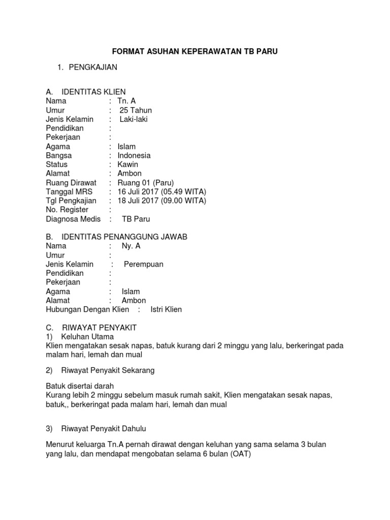 Asuhan keperawatan askep tb paru. Contoh askep tentang tb paru askep tb paru beratnya infeksi. Asuhan keperawatan askep tuberkulosis paru tb paru tuberkulosis paru tb paru a. Ada beberapa mikrobakteria patogen tettapi hanya strain bovin dan human yang patogenik terhadap manusia. Pengertian tuberkulosis merupakan penyakit infeksi yang disebabkan oleh mycobacterium tuberculosis. Penyakit tb paru merupakan penyakit menahunkronis berlangsung lama dan menular.