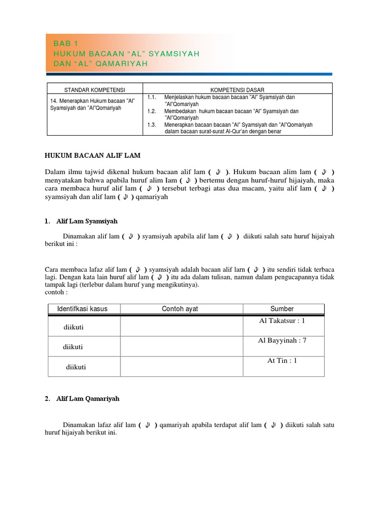 Namun sebelum pembahasan menuju pada huruf hukum bacaan ini pembahasan akan lari ke pengertian terlebih dahulu. Hukum al qomariyah adalah satu di antara dua hukum terkait hukum bacaan alif lam pada kata benda di dalam bahasa arab lebih lebih al quran. Hukum bacaan alif lam terbagi menjadi dua bagian. Ciri khusus bacaan idgham syamsiyah adalah setelah al tarif pasti ada haakat tasydid. Setelah membaca beberapa keterangan di atas coba perhatikan beberapa contoh bacaan al syamsiyah di bawah ini. Dalam mempelajari ilmu tajwid anda harus sering membaca dan memperhatikan satu persatu hurufnya dengan tertib dan teliti dibiasakan untuk membaca dengan tartil supaya anda.