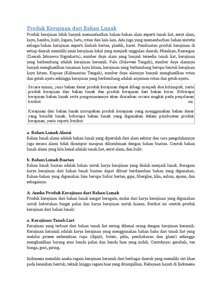 Merupakan jenis bahan lunak yang didapatkan dari alam sekitarnya dan cara pengolahannya pun dengan cara alami tidak dicampur lagi dengan bahan atau kombinasi buatan lainnya. Berikut ini contoh kerajinan dari bahan lunak alami. Sekian materi contoh produk kerajinan dari bahan lunak buatan dan alami mudah mudahan bisa memberi manfaat untuk anda semua. Di indonesia sendiri tanah liat sudah lazim digunakan untuk membuat kerajinan tangan. Bahan lunak buatan cenderung lebih mahal dari pada dengan bahan alami. Contoh bahan lunak alami secara umum prinsip pembuatan kerajinan bahan lunak alami dan buatan memiliki kemiripan sengaja dibuat orang secara khusus dan mempertimbangkan aspek pemandunya.