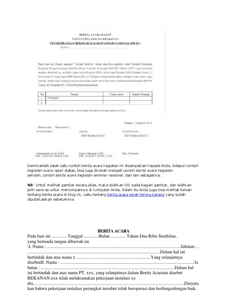 Baik peristiwa seminar kepemilikan hingga jual beli suatu barang. Sehingga membuat kamu pusing tuju keliling. Contoh contoh yang akan dipaparkan di bawah ini terdiri dari jenis contoh berita acara rapat serah terima kejadian kehilangan serah terima sebuah pekerjaan kerusakan barang acara kehilangan dokumen penting acara kegiatan sekolah contoh untuk jenis berita acara pemeriksaan dan masih banyak lagi yang lainnya. Meskinya setiap dari kita harus tahu karena berita acara ini benar benar penting bagi kita terutama ketika hendak menjalin kerja sama dengan orang lain entah itu dengan individu maupun kelompok. Contoh berita acara yang meliputi tentang kegiatan kejadian rapat serah terima barang pekerjaan dan jabatan kehilangan barang dan pemeriksaan bisa anda dapatkan secara lengkap di situs penyedia contoh surat yang bisa membantu maslah anda. Secara garis besar surat berita acara adalah surat dinas yang bisa juga dijadikan bukti yang berisi catatan catatan resmi berkaitan dengan perjalanan kedinasan peristiwa atau kegiatan tertentu.