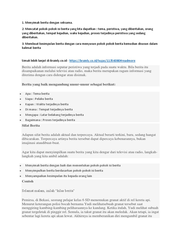 Bagi anda yang membutuhkan reverensi terkait contoh teks reporter dalam menyampaikan berita simak beberapa contohnya di bawah ini. Dalam menyimak berita kita harus memahami isi berita dengan memerhatikan pokok pokok beritanya. Menyimak dan menyimpulkan berita pengertian berita berita adalah informasi yang memuat peristiwa yang telah terjadi. Uraian berita dalam ruang lingkup satu pokok yang merupakan pendalaman tema tersebut yang dilihat dari berbagai segi latar belakang perkembangan berita tersebut. Pembawaan seorang reporter dalam menyampaikan berita berbeda beda tergantung dari jenis berita yang dibawakannya. Apa di mana kapan siapa mengapa bagaimana disingkat adik simba.