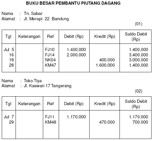 Buku besar pembantu adalah buku besar khusus yang digunakan untuk mencatat akun tertentu serta perubahan perubahannya secara lebih rinci. Buku besar sendiri sebenarnya terdiri dari buku besar bentuk t dan bentuk stafel atau skontro. Piutang yang ada pada tanggal 1 juli 2017 senilai rp12100000 dicatat pada posisi debit dengan nama akun piutang usaha dalam buku besar sedangkan rincian dari transaksi piutang tersebut dicatat dalam buku besar pembantu piutang.