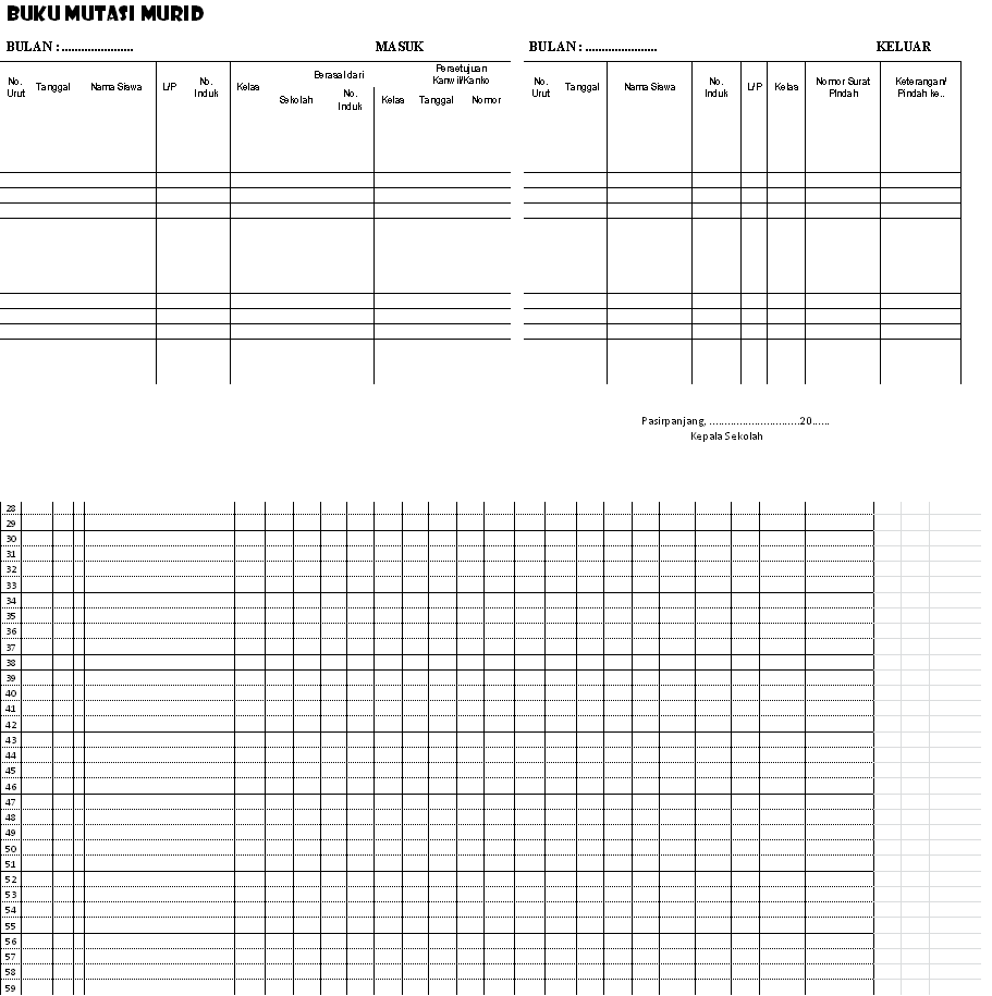 Contoh buku mutasi siswa. Download contoh buku mutasi paud tk terbaru. Dengan adanya buku mutasi paud ini akan berguna untuk pencatatan keluar masuk atau pindah ke lembaga lain atau sebaliknya pindahan dari lembaga lain. Mudah mudahan bisa menjadi referensi terbaik dalam melengkapi administrasi terkait dengan mutasi peserta didik. Download buku mutasi siswa dan contoh daftar mutasi murid setelah kami jelaskan pengertian syarat dan mekanisme mutasi siswa secara umum seperti yang telah disampaikan di atas. Sekarang saatnya anda mengunduh buku atau daftar mutasinya untuk dijadikan sebagai contoh format mungkin saja bapakibu guru membutuhkan. Pengertian buku mutasi siswa adalah buku yang dibuat untuk menjejak jumlah siswa yang keluar masuk sekolah paud sebuah lembaga.