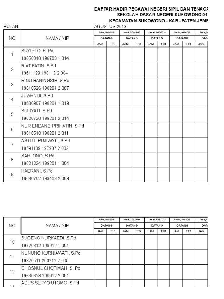 Contoh format daftar hadir karyawan berdasarkan hari sehingga data karyawan nya sangat banyak sekali. Contoh format instruksi kerja sebuah perusahaan perusahaan maka dapat dihasilkan secara elektronik. Oleh karena itu instruksi kerja yang dapat menyimpan format untuk setiap proyek akan difasilitasi. Contoh form daftar hadir rapat setiap perusahaan form daftar hadir pastilah berbeda beda. Cara membuat absensi kerja karyawan dengan format excel absen kerja memang kadang membuat kita para orang orang yang bekerja di sebuah usaha atau dengan kata lain kita yang memiliki karyawan dalam usaha kita memang sangatlah di butuhkan. Saya berharap contoh daftar hadir karyawan perusahaan yang saya bagikan ini dapat memudahkan pekerjaan anda atau mempercepat proses membuat daftar hadir karyawan perusahaan dengan microsoft word.