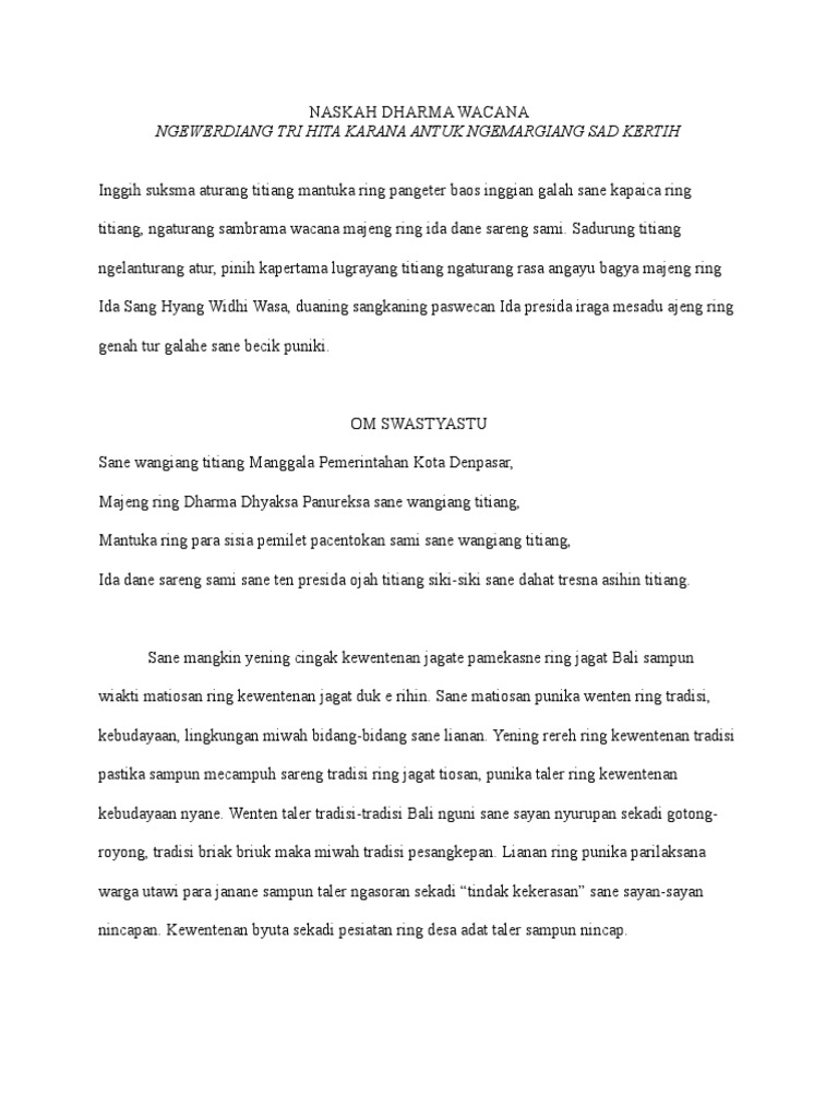 Contoh dharma wacana singkat. Wacana tri hita karana punika sering kawedar ritatkala kawentenang acara dharma wacana penyuluhan agama hindu taler sampun kabligbagan ring sekolahan sowang sowang. Contoh dharma wacana dalam bahasa bali. Om avignam astu nama sidham. Berikut ini saya akan share contoh teks dharma wacana dengan tema budaya bali semoga bermanfaat swadharmaning yowana sane pacang ngajegang budaya bali antuk maparilaksana nganutin sesana sadurung nglantur lugrayang titiang ngastiti ring ida hyang widhi wasa antuk ngaturang pangastungkara panganjali umat. Kumpulan dharma wacana blog ini membahas seputar adat istiadat budaya dan ritual dalam agama hindu. Kewentenang titiang sane kalintang tambed pacang nyobyahang indik wacana tri hita karana puniki nenten ja wenten manah titiang jaga nasikin segara utawi ngajahin ratu ida dane sareng sami sane pastika sampun wikan ring indike punika.