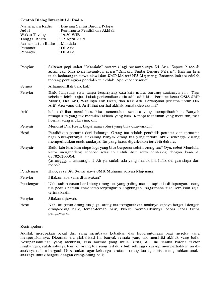 Kalaupun ada kesalahan penulisan dan tanda baca itulah karya asli mereka. Menurut bapak bagaimana pandangan dan juga opini dari bapak tentang kualitas dan mutu dari pendidikan di indonesia untuk saat ini. Dialog interaktif yang ada di televisi biasanya terjadi ketika ada suatu topik yang sedang hangat dan sering diperbincangkan baik itu tentang pendidikan keadaan ekonomi negara maupun bidang lainnya. Contoh dialog interaktif dalam kehidupan sehari hari sering kita jumpai pertemuan atau agenda yang membahas suatu hal dengan mendatangkan narasumber yang ahli baik di dalam televisi maupun kehidupan bermasyarakat. Contoh dialog interaktif dengan tema jahe dialog interaktif ini adalah karya murid saya smpn boyolangu tulungagung kelas 9 d semester 1 2012. Contoh dialog interaktif singkat tentang pendidikan pengertian dialog interaktif dialog interaktif adalah suatu kegiatan diskusi yang membahas suatu topik tertentu baik dilakukan di acara televisi radio maupun forum forum umum yang melibatkan pendengar untuk menanyakan dan menanggapi isi dari pembicaraan dialog tersebut.