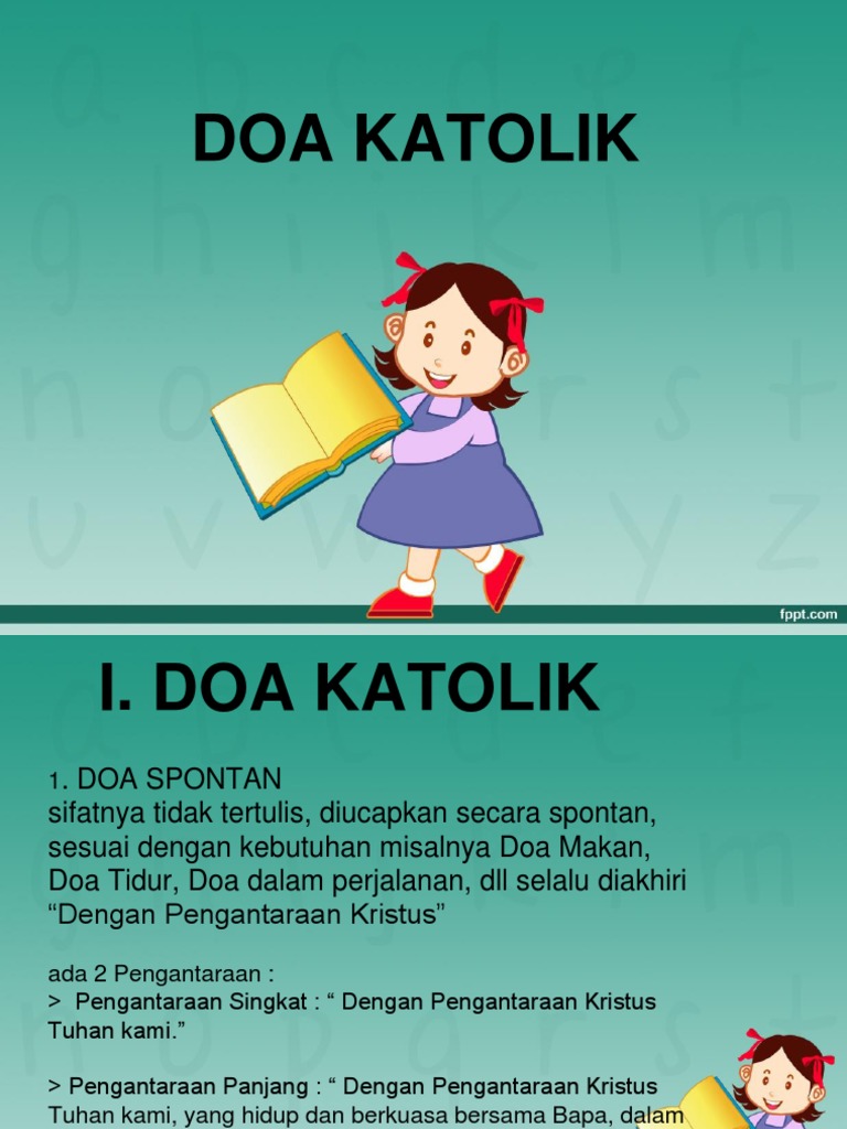 Contoh doa spontan katolik. Kami mohon dalam namamu agar allah bapa melalui doa rosario pembebasan mengutus roh kudusnya mencurahkan kedalam hati kami karunia mewartakan sabdamu dengan iman dan keteguhan. Sepuluh perintah allah pada nomor yang ke empat secara tegas menyampaikan hormatilah ayahibumu. Doa penutup o yesus terkasih tusuklah hatiku agar air mata tobat dan cinta mu akan merupakan makanan sehari hari semoga tobatku hanya untuk mu semoga hatiku merupakan tempat tinggal mu nan abadi dan akhirnya agar hidupku sedemikian sempurna sehingga aku layak berada disamping mu di surga dan disana bersama para kudus. Pas bagian doa umat pastor memberi kesempatan pada pasangan pasutri yang berultah perkawinan itu untuk mengucapkan doa spontan. Dimulai dari ayah kemudian ibu berlanjut ke anak anak mereka. Doa di dalam keluarga katolik bisa dilakukan secara spontanitas maupun dengan panduan sebuah buku atau text.