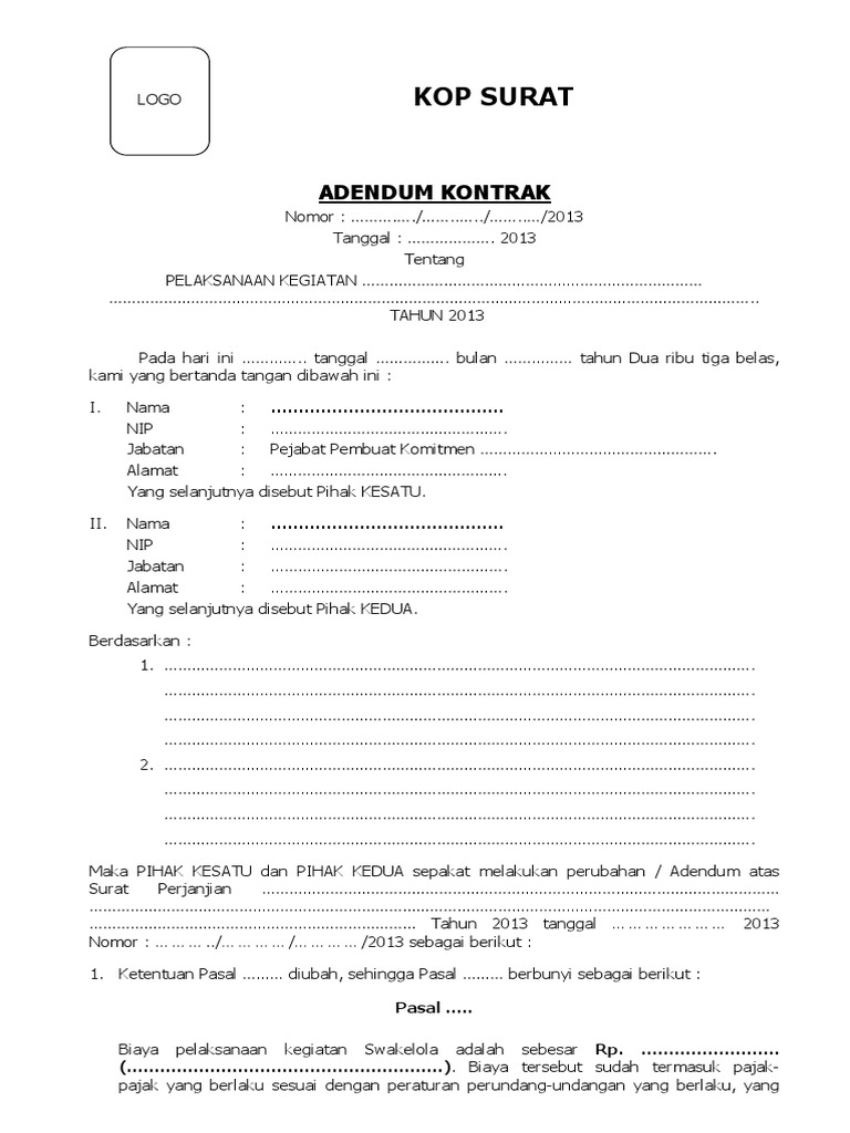 Pekerjaan tersebut di atas dilaksanakan di lingkungan rs. Selengkapnya apa artinya adendum kontrak kapan adendum dibuat hal hal apa saja yang dapat dilakukan adendum kontrak dan contoh adendum kontrak yang bisa kamu jadikan panduan untuk mengajukan adendum pada kontrak akan kami jelaskan pada postingan kali ini. Dokumen kontrak nasional ncb sesuai urutan kekuatan hukumnya terdiri atas sebagai berikut. Contoh perubahan kontrak adendum karena pember. Jika dalam suatu pembuatan surat kontrak atau perjanjian terdapat hal hal yang belum ditambahkan atau harus diperbaiki atau harus dihilangkan atau harus dikurangi maka perubahan tersebut dapat dibuat dalam dokumen baru yang disebut surat addendum. Subkon berdasar dokumen tender se pu pr.