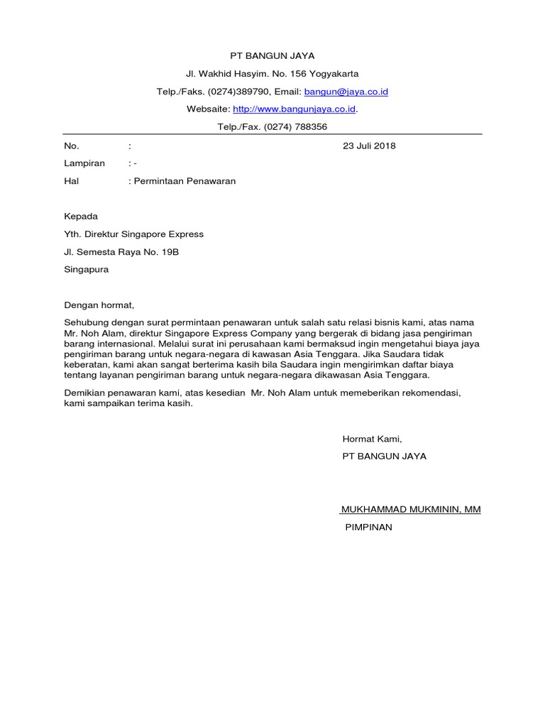 Adapun surat yang dipergunakan oleh suatu perusahaan atau instansi merupakan jenis jenis surat resmi dimana penulisannya harus sesuai dengan kaidah kaidah penulisan surat resmi dan penggunaan bahasa yang baik serta sesuai dengan. Contoh surat penawaran dewasa ini surat penawaran menjadi salah satu hal penting utama dalam hal perdagangan. Surat itu bermaksud meminta kepada penjual agar memberikan penawaran sacara resmi. Surat permintaan penawaran adalah surat yang dibuat oleh calon pembeli berisi permintaan penawaran kepada penjual.