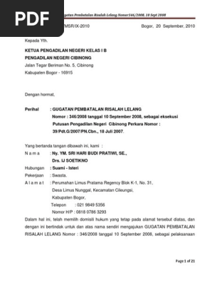 Contoh gugatan pembatalan lelang. Contoh surat surat wasiat adalah surat pernyataan yang dibuat seseorang berupa pesan atau amanat yang ingin dilaksanakan saat telah meninggal dunia. Debitur yang merasa dirugikan kerap mengajukan gugatan pembatalan lelang. Gugatan perdata masalah hutang masalah penipuan masalah tanah surat gugatan. Saat ingin berpindah kerja harus melewati pengunduran diri. P 25 bc2007 bcf 15 sebagai daftar barang impor yang dinyatakan sebagai barang yang dikuasai oleh negara. Dari pengalaman advokasi kami seputar gugatan pembatalan lelang atas jaminan yang dibebani dengan hak tanggungan kami menemukan adanya celah hukum bagi debitur untuk menggugat pembatalan lelang hak tanggungan dengan dalil misalnya adanya perbuatan melawan hukum atau penyalahgunaan keadaan misbruik van omstadigheden pada waktu pembuatan perjanjian utang piutang sebagai perjanjian pokoknya.
