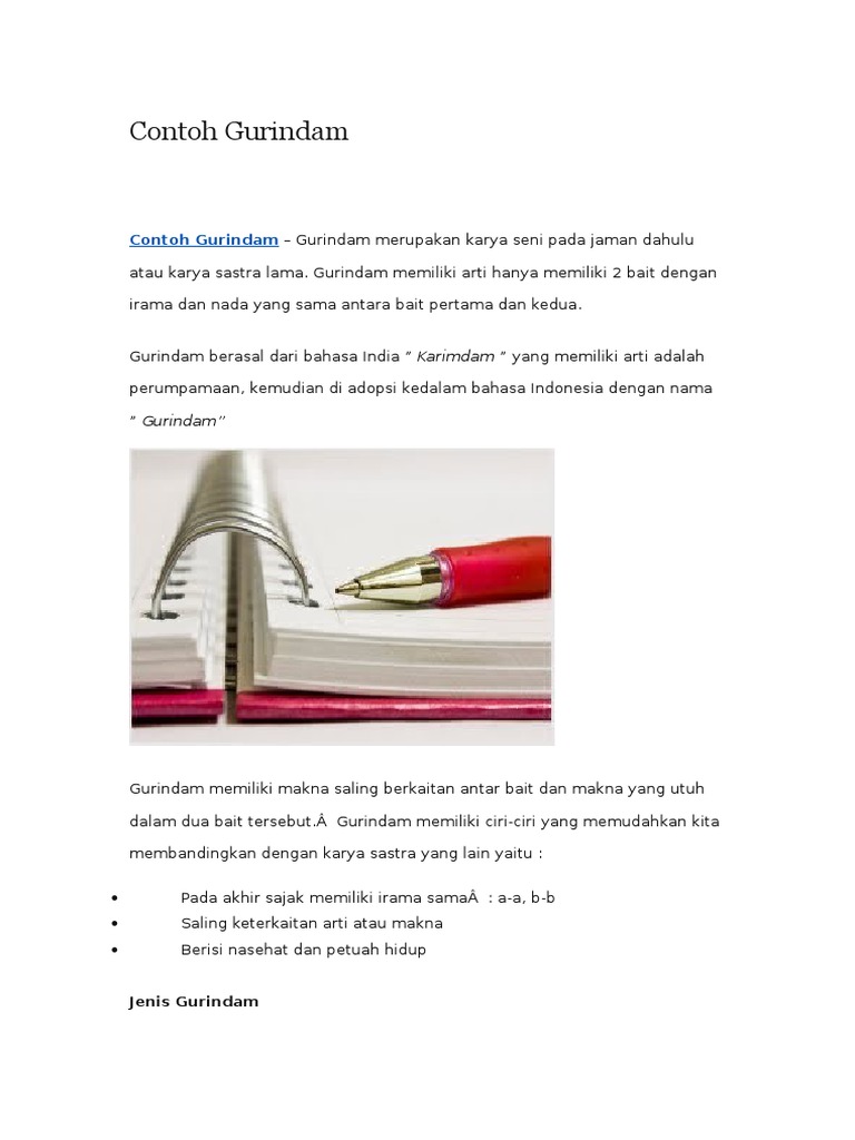 Adalah kirindam yang memiliki arti asal muasal perumpamaan atau amsal. Bila kita lihat pada barisnya ada 2 macam jenis gurindam yakni gurindam berangkai dan berkait. Contoh gurindam pendidikan dalam bahasa indonesia sebelumnya kita sudah mengetahui contoh dari salah satu jenis gurindam yaitu contoh gurindam berkaitkali ini kita akan mengetahui contoh gurindam dengan tema khusus di mana tema khusus pada contoh gurindam kali ini adalah pendidikan. Contoh pantun nasehat pantun adalah salah satu jenis karya puisi lama dengan 4 baris dan sajak a b a b di akhir larik baris pertama dan baris kedua berupa sampiran sedangkan baris ketiga dan keempat merupakan isikali ini akan dibagikan contoh contoh pantun nasehat dan maknanya. Contoh gurindam beserta maknanya gurindam merupakan salah satu diantara jenis jenis puisi lama selain jenis jenis pantun jenis jenis syair contoh pantun talibun contoh pantun karmina pantun berkait dan contohnya dalam bahasa indonesia dan contoh bidaladapun definisi gurindam sendiri adalah suatu karya sastra yang serupa puisi dan terdiri atas dua baris. Gurindam yang berisi nasehat memiliki ciri spesifik seperti memiliki 2baris dan akhiran dengan rima yang sama.