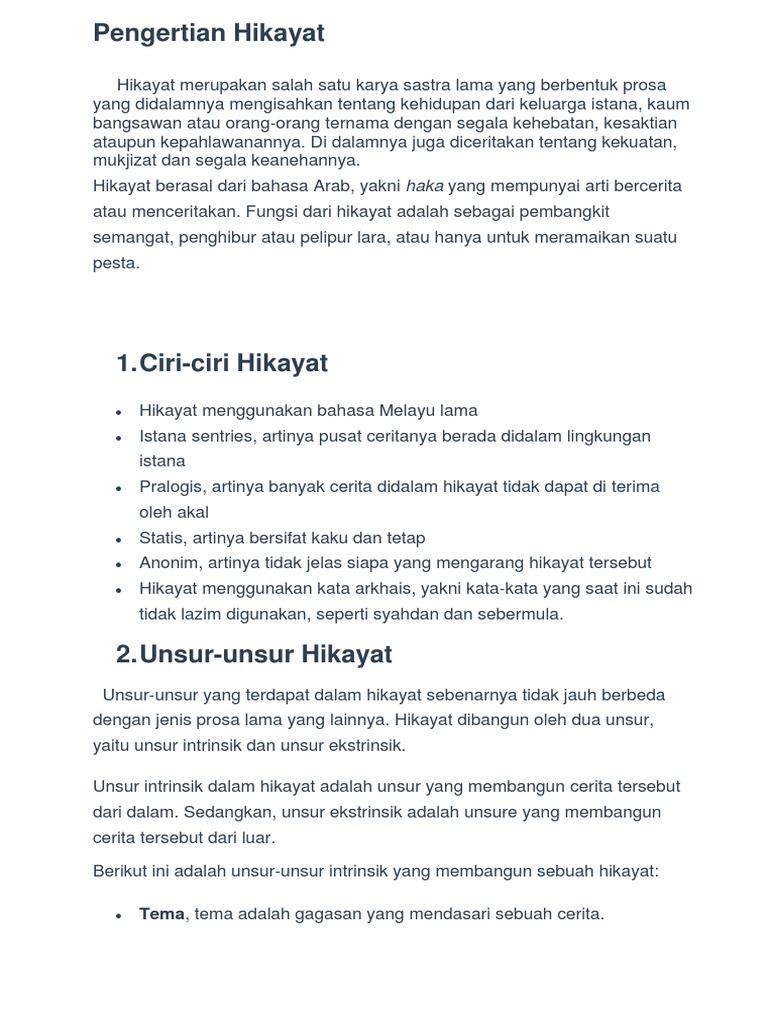 Secara umum hikayat sering bertemakan dan juga berlatarkan sebuah kerajaan. Contoh hikayat melayu dalam kesusasteraan indonesia hikayat melayu merupakan salah satu diantara macam macam hikayatjenis hikayat ini merupakan jenis hikayat yang ada di tanah melayu. Hikayat mulai berkembang pada masa melayu klasik sehingga banyak kata yang digunakan dalam hikayat mengandung bahasa melayu klasik yang terkadang susah untuk dimengerti. Istana sentris artinya pusat dari ceritanya berada pada lingkungan sebuah istana atau kerajaan. Ciri ciri hikayat. Dari penjelasan tersebut dapat diketahui bahwa hikayat dipengaruhi dari beberapa wilayah seperti arab persia melayu india serta jawa.