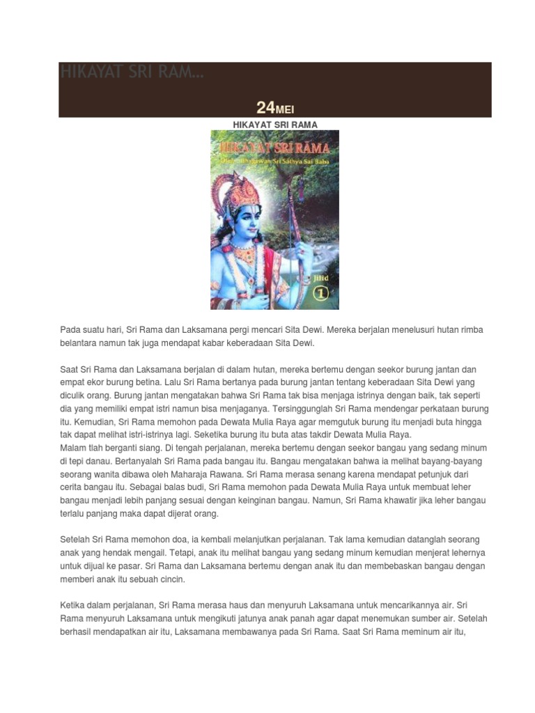 Salah satunya adalah untuk tidak berlaku sombong karena apa yang kamu sombongkan itu bisa diambil sewaktu waktu seperti apa yang terjadi pada burung jantan itu. Hikayat ini memiliki dua versi yang agak berbeda. Saat sri rama dan laksamana berjalan di dalam hutan mereka bertemu dengan seekor burung jantan dan empat ekor burung betina. Hikayat sri rama adalah bahasa melayu untuk cerita rama. Contoh hikayat sri rama hikayat sri rama. Saat sri rama dan laksamana berjalan di dalam hutan mereka bertemu dengan seekor burung jantan dan empat ekor burung betina.