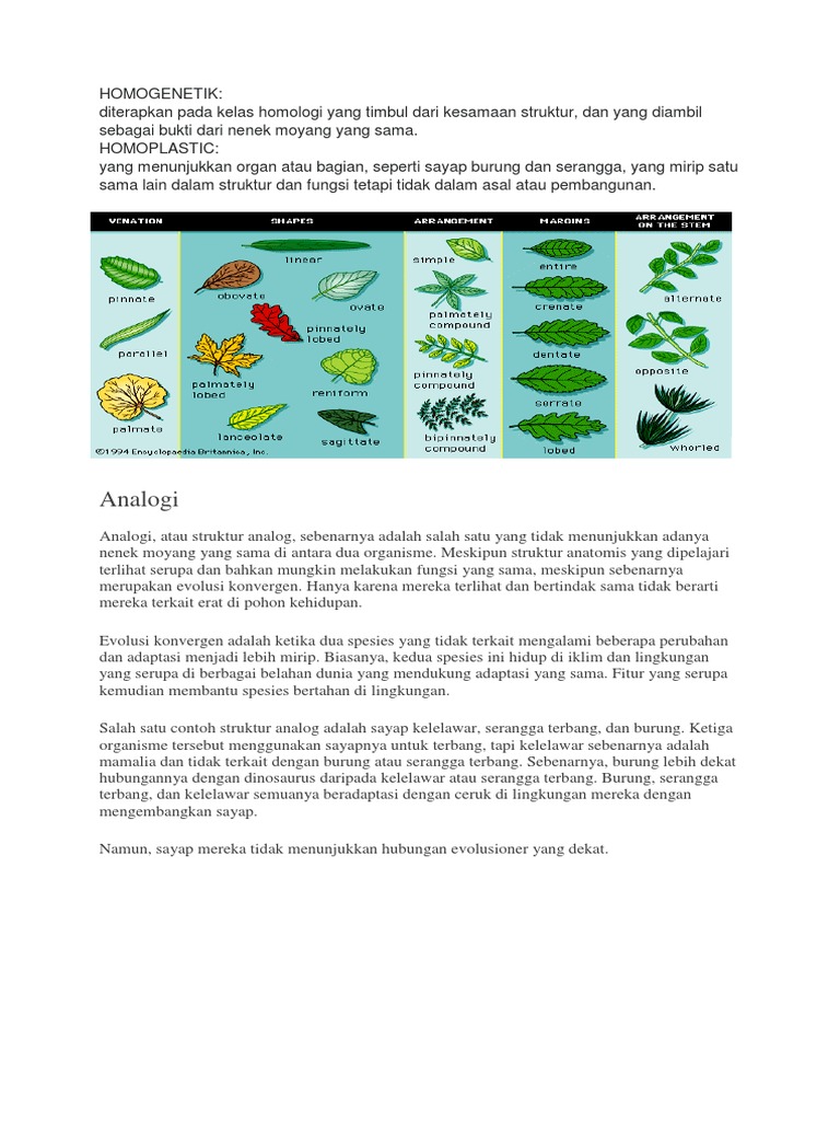 Hiu dikelompokkan dalam keluarga ikan sementara lumba lumba adalah mamalia. Sayap burung dan tangan manusia. Analogi argumentatif atau induktif memiliki pola seperti pada sebuah paragraf induktif yaitu khusus khusus umum. Baik struktur homologi maupun analogi diturunkan sebagai adaptasi terhadap lingkungan. Bidang biologi evolusioner menggunakan homologi dalam pengertian kemiripan dalam bentuk atau perilaku antara dua spesies akibat keduanya memiliki kesamaan moyangdalam anatomi perbandingan banyak dijumpai contoh contohnya misalnya sirip depan lumba lumba tungkai depan singa laut dan kaki depan pada anjing adalah homologi karena semuanya berasal dari organ. Namun keduanya hidup di lingkungan yang sama di laut di mana sirip adalah adaptasi yang baik untuk hewan yang perlu berenang dan bergerak di air.