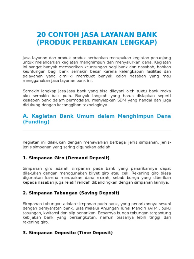 Contoh jasa layanan bank. Reksa dana reksa dana merupakan wadah yang dipergunakan untuk menghimpun dana dari masyarakat pemodal untuk selanjutnya diinvestasikan dalam protofolio efek oleh manajer investasi. Semakin lengkap jasa. Berikut jasa dan layanan umum yang dimiliki bank untuk nasabahnya. 20 contoh jasa layanan bank produk perbankan lengkap produk pembiayaan bank syariah a. Jasa asuransi bank dan finansial seperti asuransi pribadi jasa kredit pinjaman atau pajak. Jasa transportasi seperti pelayanan jasa angkutan barang penumpang atau penyewaan.