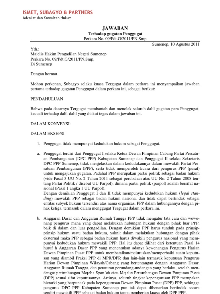 1 selain itu jawaban yang disampaikan oleh tergugat dapat sekaligus memuat eksepsi dan bantahan terhadap pokok perkara. 12b tanjung gading bandarlampung. Demikian beberapa contoh surat jawaban gugatan untuk berbagai perkara. Surat jawaban atas gugatan dengan nomor perkara 200pdtg2012 pnim kepada yang yth. Semoga bermanfaat untuk anda yang sedang menyusun format surat jawaban gugatan. Contoh eksepsi jawaban tergugat.