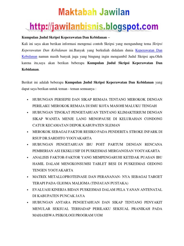 Contoh judul skripsi keperawatan. Contoh skripsi keperawatan kuantitatif terbaik lengkap dan mudah dikerjakan dibawah ini bisa menjadi referensi terbaik dalam mendapatkan judul skripsi. Hubungan pengetahuan ibu tentang manajemen laktasi dengan perilaku dalam pemberian asi di desa kenokorejo polokarto sukoharjo. Memang saya harus sedikit lebih teliti dan bekerja sebaik baiknya untuk menyajikan ke hadapan kakak semua artikel yang berjudul 450 contoh judul skripsi keperawatan gratis terbaru most recommended ini. Contoh skripsi keperawatankumpulan skripsi lengkap judul skripsi lengkap contoh skripsi download skripsi daftar judul skripsi koleksi skripsi skripsi gratis judul skripsi semua jurusan. Contoh skripsi keperawatan untuk mendapatkan file lengkap dalam bentuk ms word mulai bab 1 sd. Skripsi merupakan suatu karya tulis ilmiah yang berupa paparan tulisan dari hasil penelitian dan membahas suatu permasalahan dalam bidang ilmu tertentu serta menggunakan kaidah yang berlaku.