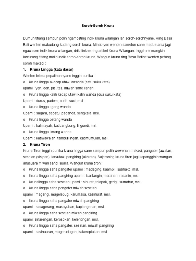 Tios ring punika krunaalus mider taler maderbe wangun andap. 1 kruna andap 2 kruna mider 3 kruna alus mider ami 4 kruna alus madia ama 5 kruna alus singgih asi 6 kruna alus sor aso lan 7 kruna kasar. Dalam perkembangannya sastra bali modern diciptakan oleh para sastrawan agar lebih dikenal oleh generasi muda karya sastra ini memiliki nilai moral yang sangat kuat jika kita membacanyatetapi untuk meningkatkan minat baca para generasi muda kususnya pelajar untuk membacanya kita harus memiliki cara cara jitu untuk mengemas bahasa bali agar lebih menarikmendidik dan jenaka. 1 kruna andap 2 kruna mider 3 kruna alus mider ami 4 kruna alus madia ama 5 kruna alus singgih asi 6 kruna alus sor aso lan 7 kruna kasar. Kruna alus mider inggih punika kruna alus sane rasa basannyane madue wiguna kakali dados kanggen nyinggihang dsang singgih miwah kangge ngesorang sang sor. Sor singgih basa taler kabaosang anggah ungguhing basa taler kangkat kabaos unda usuk basa.