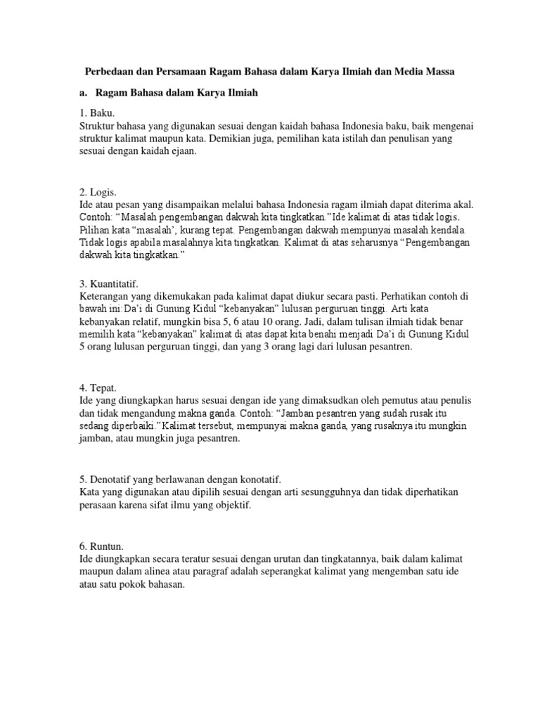 Ciri ciri bahasa resmi yaitu digunakan dalam situasi resmi nada bicara yang cenderung datar dan kalimat yang digunakan adalah kalimat lengkap. Inilah contoh contoh kalimat dari ragam lisan maupun tulisan. Contoh perbedaan ragam bahasa lisan dan ragam bahasa tulis berdasarkan tata bahasa dan kosa kata. Baku atau tidak bakunya suatu kata ditentukan sesuai pedoman umum ejaan bahasa indonesia yang disempurnakan eyd. Bahasa indonesia sendiri diresmikan dalam penggunaannya setelah keluarnya proklamasi kemerdekaan bangsa indonesia lebih tepatnya sehari setelahnya. Nia sedang baca surat kabar.