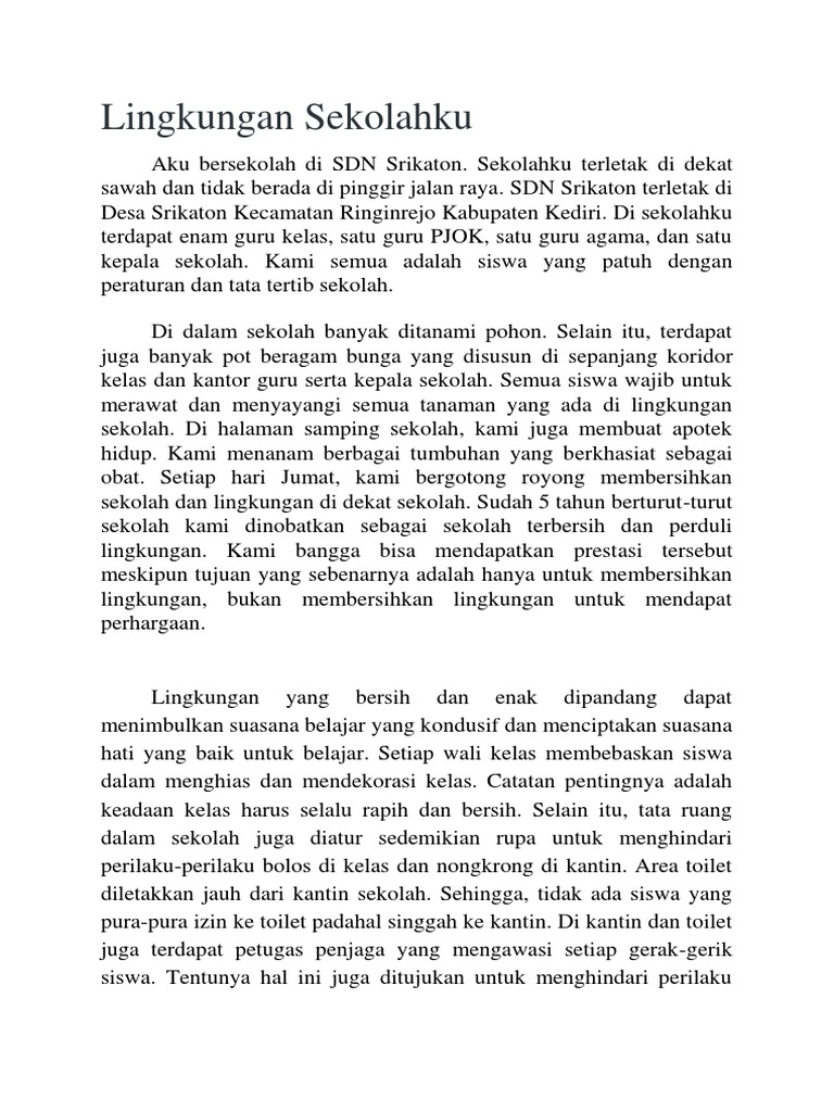 Contoh karangan tentang lingkungan sekolah. Sekolah saya terletak tepat di jantung kota dan dekat dengan pusat perbelanjaan dan kantor polisi. Demikian untuk contoh karangan bahasa sunda tentang kebersihan lingkungan sekolah mohon maaf apabila ada kesalahan dalam penulisan karya tulis dalam penggunaan bahasa sunda diatas. Cerita tentang lingkungan pada kali ini rumus coid akan membahas mengenai cerita tentang lingkungan di dalam pembahasan ini kita akan menerangkan mulai dari pengertian ciri kesimpulan makalah struktur jenis dantujuan fungsi dan kaidah konsep lengkap dengan contoh nya. Berikut ini anda bisa melihat contoh paragraf deskripsi tentang sekolah dibawah ini. Contoh karangan tentang lingkungan sekolah 4. Sekolahku ini letaknya tidak jauh dari taman kota dan mempunyai sekitar 100 buah ruanganya yang sebgaian besarnya adlah ruang kelas.