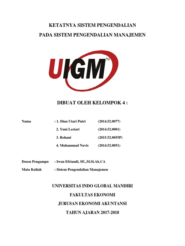 Telah berhasil diimplementasikan secara individu sehingga secara keseluruhan dalm organisasi telah menjadi suatu budaya perusahaan. Contoh kasus sistem pengendalian manajemen xerox corporation latar belakang xerox adalah perusahaan yang melayani pemrosesan dokumen secara global dan pasar jasa keuangan. Pengendalian dalam organisasi contoh pengendalian manajemen lingkungan pengendalian mencerminkan sikap dan tindakan para pemilik dan manajer perusahaan mengenai pentingnya pengendalain intern organisasi. Sebagai contoh dalam suatu organisasi yang pimpinan puncaknya menganggap. Efektivitas unsur pengendalian intern sangat ditentukan oleh atmosfer yang diciptakan lingkungan pengendalian. Pengertian karakteristik unsur proses dan faktor yang mempengaruhi sistem pengendalian manajemen sistem pengendalian manajemen adalah suatu sistem yang cenderung mengarah pada pengendalian kegiatan dengan dominasi tinggi dan menyeluruh untuk memperoleh kepercayaan bahwa strategi dan kinerja perusahaan sudah dilakukan secara efektif dan efisien.