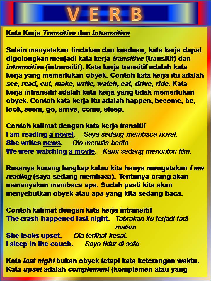 Kata jenis ni seringkali dipakai sebagai predikat dalam sebuah kalimat atau frasa. Kata kerja berasal dari bahasa latin yaitu dari kata verbum yang memiliki arti kata. Secara umumnya sangat mudah menemukan kata kerja dalam suatu kalimat. Kata kerja benefaktif kata kerja benefaktif adalah kata kerja yang menunjukkan pekerjaan atau tindakan yang dilakukan untuk orang lain. Adapun arti kata kerja mental adalah kata kerja yang mengekspresikan respon seorang individu terhadap pengalaman tindakan dan sikap yang mereka lakukan. Kata kerja mental atau kata kerja behavioral kerap kali disebut dengan verba tingkah laku.