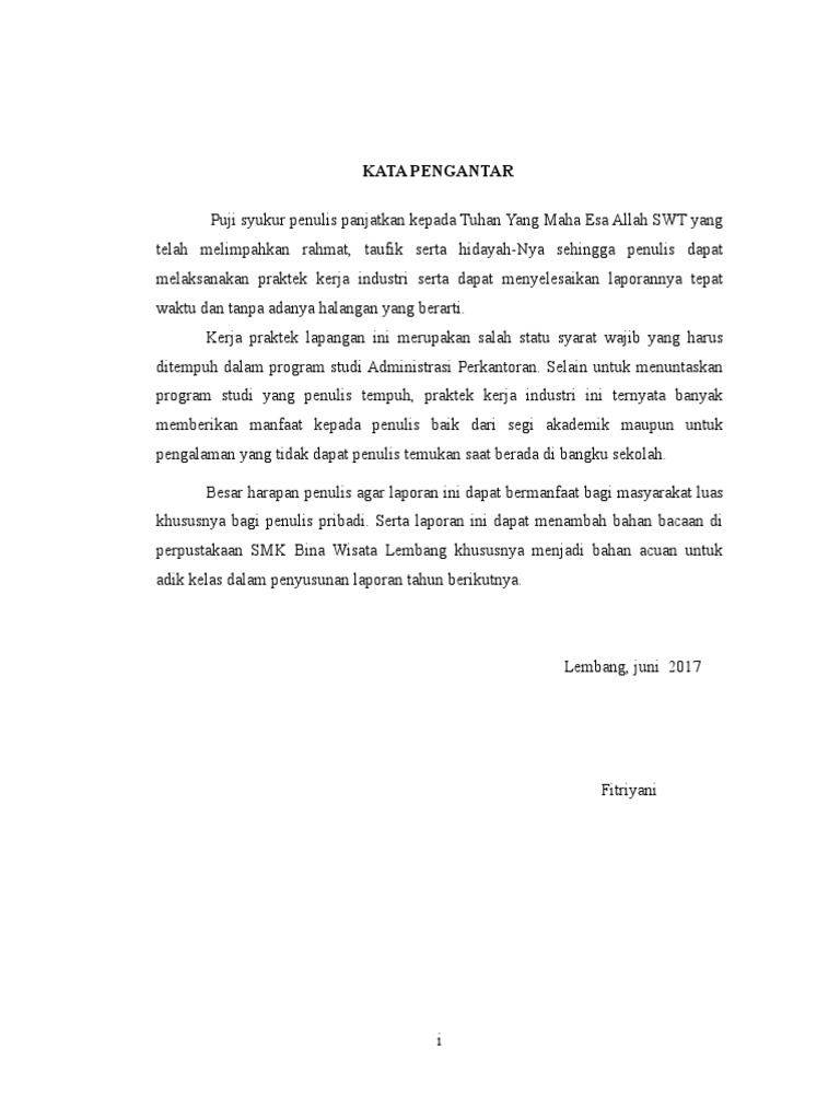 Segala puji bagi allah swt yang telah memberikan nikmat yang tiada terhitung kepada kami sehingga kami dapat menyelesaikan laporan praktek kerja instansi prakerin ini dengan lancar tanpa hambatan yang berarti. Tentunya bukan dalam laporan saja kata pengantar juga ada sistematikanya dan cara membuat contoh kata pengantar prakerin yang baik dan benartidak sembarang dalam penulisan tersebut misalnya harus ada beberapa kalimat yang mengucapkan rasa syukur kepada tuhan yang maha esa ucapan terimakasih kepada pembaca dan semua pihak yang telah membantu dalam penulisan karya ilmiah laporan praktek. Kita hanya perlu mengikuti beberapa kaidah penyusunan laporan. Orang belagu 18 maret 2017 2011.