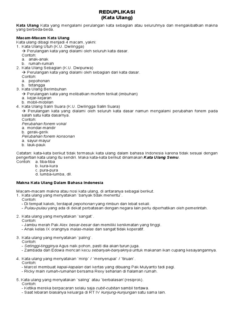 Malas bermalas malasan tinggi setinggi tingginya pandai sepandai pandainya. Menurut waridah dkk 2015278 kata ulang sebagian adalah reduplikasi yang pengulangan katanya terjadi hanya pada sebagian bentuk dasarnya. Contoh kata ulang sebagian menurut kamus besar bahasa indonesia kata kata berarti unsur unsur bahasa lisan atau tulisan yang mewakili perwujudan kesatuan perasaan dan pikiran yang dapat digunakan dalam bahasa tersebut. Kata ulang pengertian macam makna prinsip bentuk contoh. Kata ulang adalah bentuk kata yang diperoleh melalui proses reduplikasi atau pengulangan baik secara keseluruhan sebagian maupun perubahan. Dengan kata kata yang diulang sebagian bagian dari kata dasar diulang.