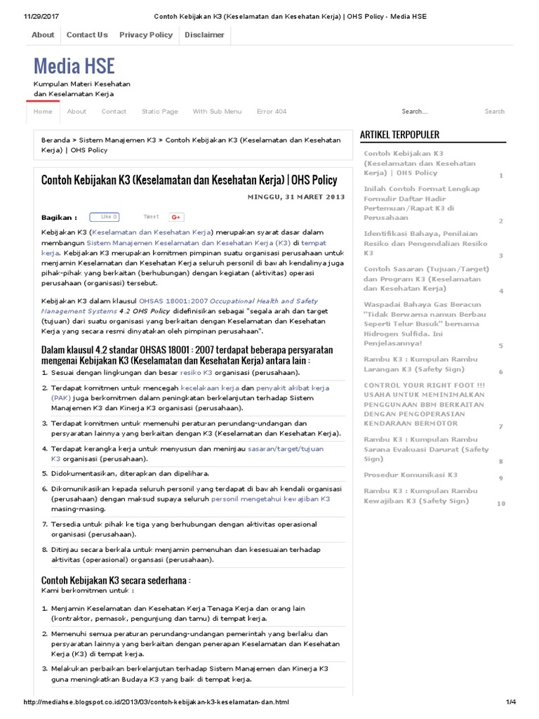Contoh surat kebijakan perusahaan. Menyediakan sarana dan prasarana k3 yang memadai. Sebagai contoh perusahaan yang bergerak dibidang kontraktor instalasi listrik akan mempunyai kebijakan yang berbeda dengan perusahaaninstansi pelayanan kesehatan masyarakat. Kebijakan smk3 ohsas 18001 harus dibuat apabila perusahaan akan menerapkan sistim manajemen k3 atau smk3 berikut contoh kebijakan smk3. Kebijakan k3 tentu berbeda antara satu perusahaan dengan perusahaan lain tergantung jenis bahaya yang ada dalam sebuah perusahaan tersebut. Contoh bentuk laporan qc.