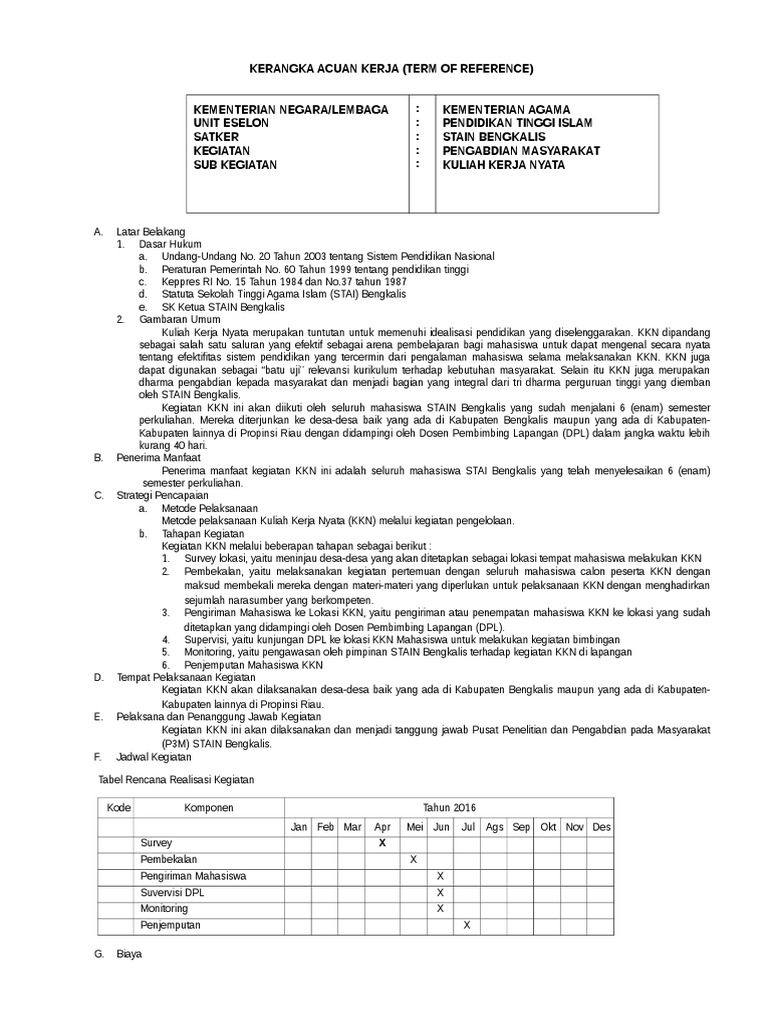 Kegiatan rapat koordinasi bidang kesejahteraan rakyat pembekalan kepala desa lokasi kkn uns tahun 2017 view. Kerangka acuan kerja penyusunan profil dan analisis program kb ks di provinsi jawa tengah tahun 2018. 1 persiapan dilakukan dengan menyusun tema kegiatan kerangka acuan kerja jadwal dan penentuan narasumber kegiatan. Kerangka acuan kerja atau juga disebut term of reference tor pengadaan barang adalah suatu dokumen yang menginformasikan gambaran latar belakang tujuan ruang lingkup dan struktur sebuah proyek pengadaan barang yang telah disusun oleh skpddinas terkait.