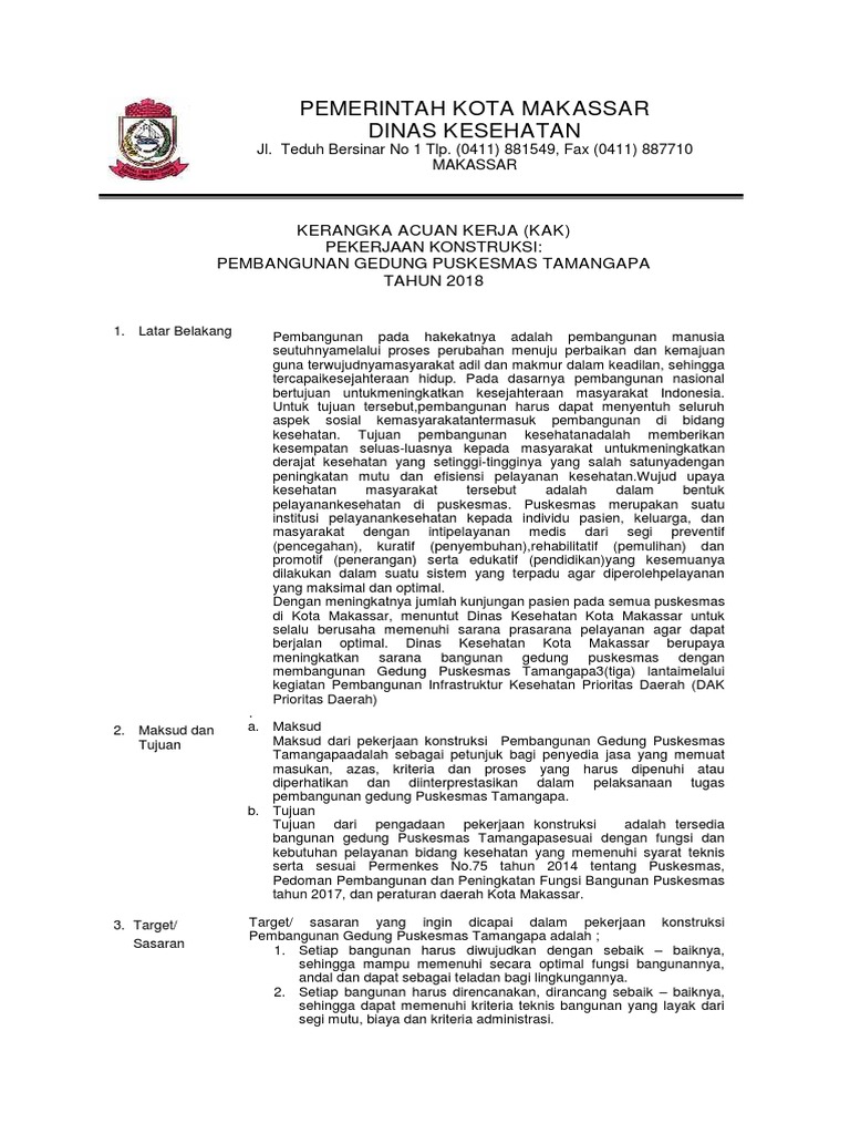 Kerangka acuan kerja kak pekerjaan perencanaan pembangunanrehabilitasirenovasirestorasi kegiatan 1. 20 contoh kerangka acuan kerja kak pengadaan barang dan jasa dari berbagai jenis pekerjaan kerangka acuan kerja atau juga disebut term of reference tor pengadaan barang adalah suatu dokumen yang menginformasikan gambaran latar belakang tujuan ruang lingkup dan struktur sebuah proyek pengadaan barang yang telah disusun oleh skpd dinas terkait. Pekerjaan pembangunan ruang lobby antara gedung b dan c badan diklat kemendagri adalah merupakan pekerjaan yang terintegrasi. Kerangka acuan kerja judul penugasan pembangunan rumah pengetahuan. Contoh format kerangka acuan kerja pengadaan pekerjaan konstruksi kerangka acuan kerja kak. Kerangka acuan kerja kak untuk pekerjaan konstruksi perlu disiapkan secara matang sehingga mampu mendorong perwujudan karya konstruksibangunan gedung yang sesuai dengan fungsinya.