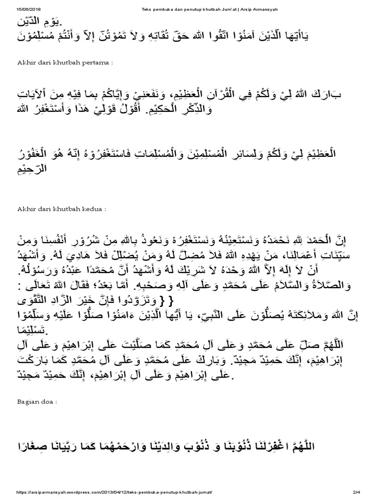 Setelah itu dilanjutkan dengan berdoa kemudian membaca hamdalah lalu diakhiri dengan salam penutup. Biasanya ritual khutbah tersebut dilaksanakan sebelum shalat jumat dilaksanakan. Contoh teks khutbah jumat lengkap dengan pembuka dan penutup serta rukun khutbah jumat sebagai salah satu syarat sah salat jumat. Adapun proses shalat jumat mungkin sudah kita ketahui bersama garis besar tata caranya mulai dari khutbah pertama lalu khatib duduk hingga khotib berdiri untuk menyampaikan khotbah kedua serta membaca doa penutup untuk selanjutnya melaksanakan shalat jumat. Teks bacaan doa khutbah jumat sebagai seorang muslim kita para laki laki diwajibkan untuk melaksanakan sholat jumat. Oleh armansyah berikut adalah teks pembuka dan penutup khutbah jumat yang biasa dibacakan oleh khatib.