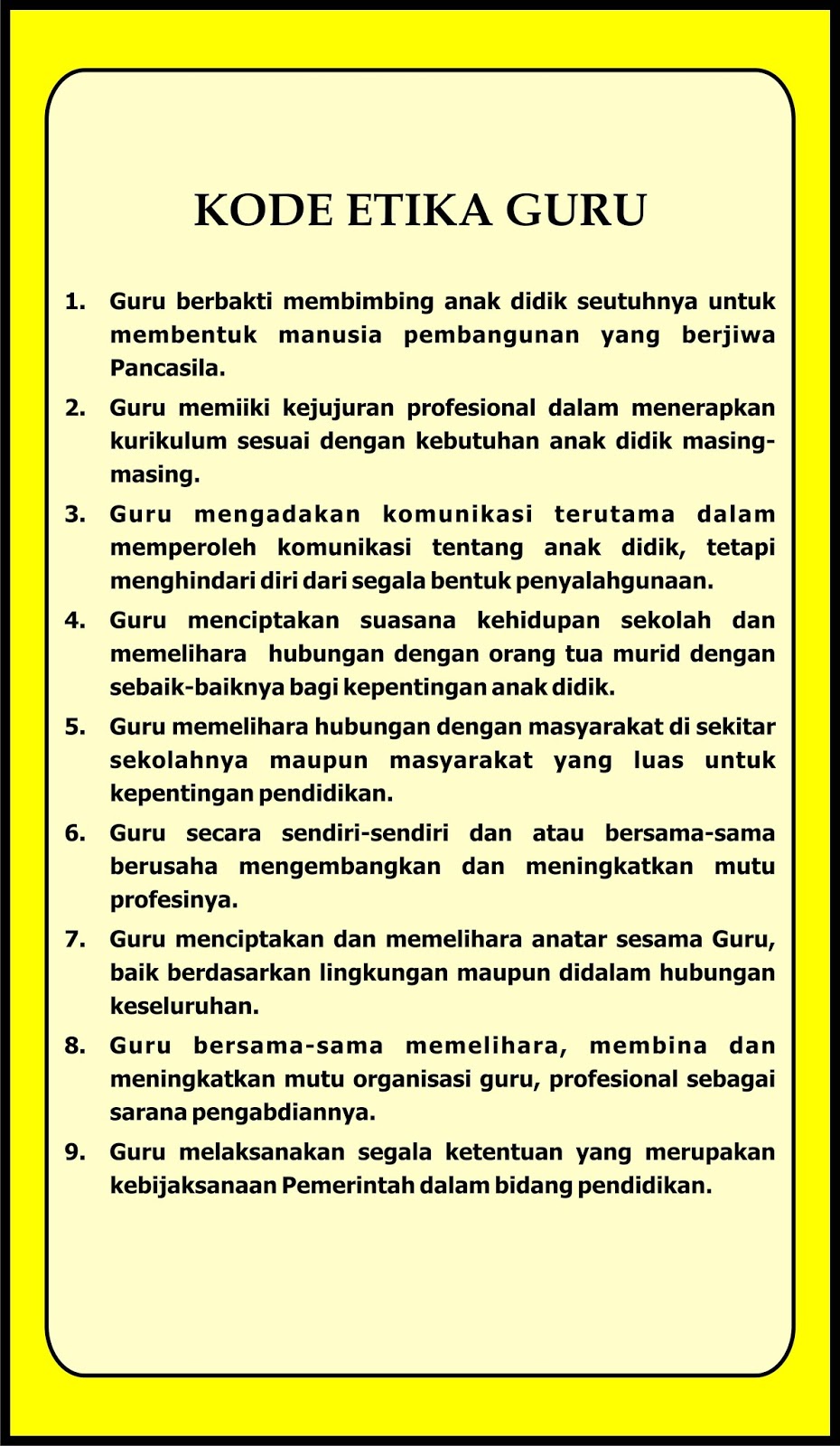 Guru berbakti membimbing anak didik seutuhnya untuk membentuk manusia pembangun yang berjiwa pancasila. Buku kode etik guru jurnal. Hal tersebut tentunya dipengaruhi oleh tingkat kesulitan di dalam memberikan didikan kepada anak terutama yang memiliki sifat cukup bandel. Menurut kode etik guru indonesia hasil kongres pgri ke xx tahun 2008 kode etik guru indonesia adalah norma dan asas dan diterima oleh guru guru indonesia sebagai pedoman sikap dan peilaku dalam melaksanakan tugas profesi sebagai pendidik anggota masyarakat dan warga negara. Isi dan bunyi kode etik profesi guru pgri secara lengkap pengertian tujuan fungsi sumpahjanji nilai dasar operasional hubungan guru dengan peserta didik orang tua masyarakat sekolah organisasi profesi dan pemerintah pelaksanaan pelanggaran dan sanksi.