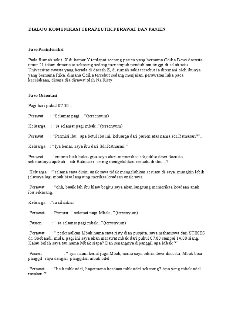 Dialog komunikasi terapeutik perawat dan pasien fase prainteraksi pada rumah sakit x di kamar y terdapat seorang pasien yang bernama odilia dewi dacosta umur 21 tahun dimana ia sekarang sedang menempuh pendidikan tinggi di salah satu universitas swasta yang berada di daerah z di rumah sakit tersebut ia ditemani oleh ibunya yang bernama rika dimana odilia tersebut sedang menjalani perawatan. Namun saat anak mengalami diare maka anda harus waspadaihal ini dikarenakan diare bisa berlangsung lama apalagi di usia mereka lebih. Contoh komunikasi terapeutik komunikasi terapeutik. Dapat meringankan beban pikiran pasien. Perlak dan handuk kecil dibentangkan di bawah kepala. Bahwa diare merupakan cara tubuh mengeluarkan virus pada tubuh.