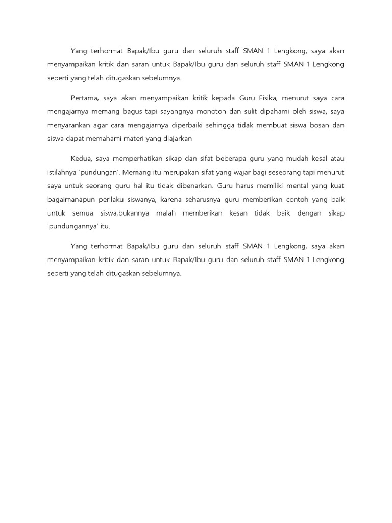 Ani memang anak yang rajin tetapi suka berbicara kasar seharusnya ani lebih menjaga kesopanannya dalam berbicara. Sebuah kritik dan saran untuk para dosen guru dan para calon guru sekalian ini bukan merupakan sekumpulan kata kata iseng anarkis ataupun bentuk protes keras kepada dunia pendidikan. Untuk memperbaiki mutu dan kepribadian guru dibimbing oleh pimpinan sekolah kepala sekolah pengawas komite sekolah dan menerima masukan dari teman kerja serta lingkungan di sekitar sekolah. Selain saran maka kritik adalah sebuah karya dengan pendapat yang berisi komentar pada suatu objek atau masalah yang diusulkan dan kritis dapat. Semoga tahun 2013 dan selanjutnya lebih baik dari sebelumnya. Contoh kritik dan saran dalam kamus besar bahasa indonesia telah berpendapat hal ini adalah sebgai kalimat yang disarankan dengan dan diartikan sebagai kalimat yang berisi pendapat dengan memiliki bentuk solusi tentang masalah atau objek.