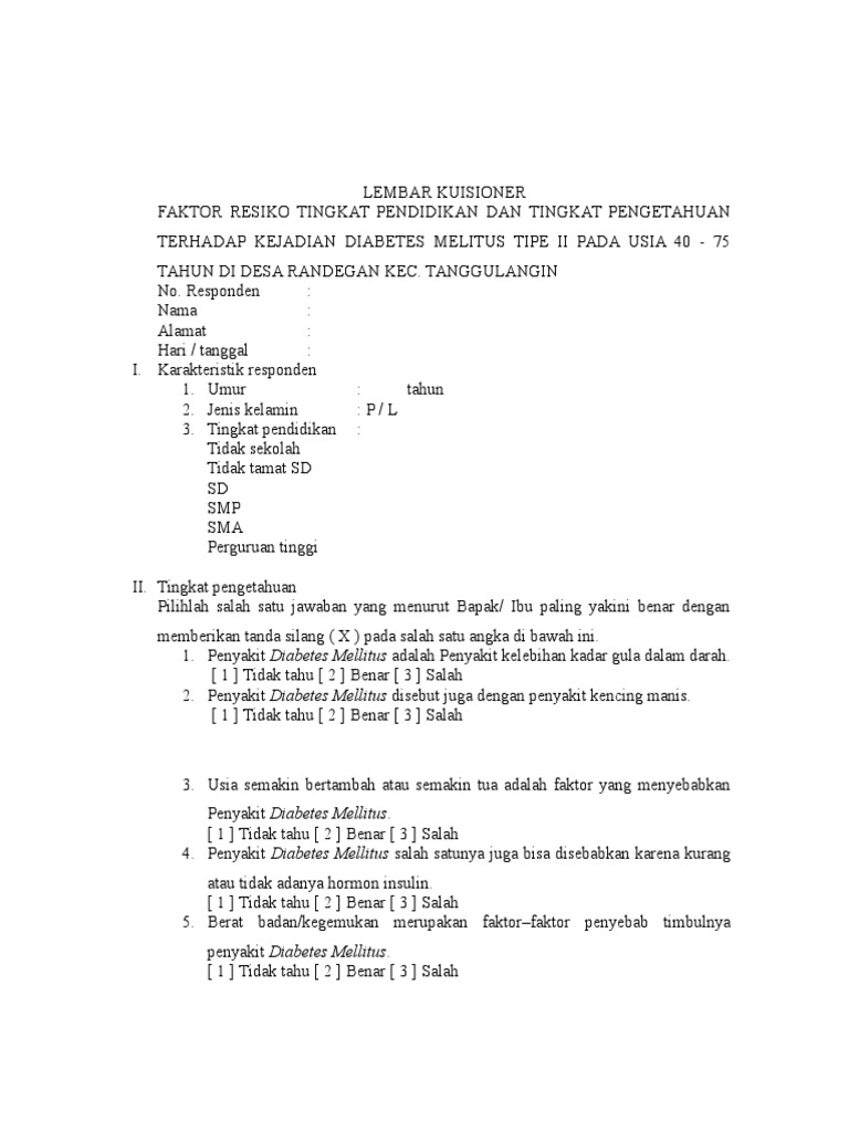 Contoh kuesioner diabetes melitus tipe 2. Mengetahui hubungan pengaturan makan pada pasien diabetes melitus. 5 untuk mengetahui gambaran proporsi kadar gula darah post prandial penderita diabetes melitus tipe 2 yang mendapat terapi diet. Penderita diabetes melitus tipe 2 merupakan jenis tipe dm yang diderita hampir 90 di dunia. Diabetes mellitus adalah suatu penyakit kronis yang ditandai dengan ketidakmampuan tubuh untuk melakukan metabolisme karbohidrat lemak dan protein sehinggga menyebabkan hiperglikemia peningkatan kadar gula darah. Pengetahuan kepatuhan diabetes melitus tipe 2 rsud. Penyakit diabetes mellitus merupakan penyakit yang bersifat.