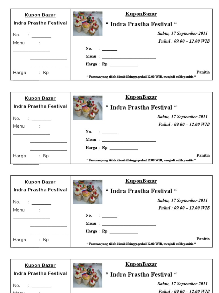 Cara membuat kupon bazar makanan. Contoh kupon bazar makanan. Membuat desain kupon bazar makanan menggunakan aplikasi corel draw acara bazar merupakan salah satu acara yang menarik sekali banyak sekali acara bazar yang dapat diadakan salah satunya adalah bazar makanan. Mulai dari menu makanan dan minuman lokasi serta nomor peserta. Ketika membelinya kita diberikan kupn tersebut yang harus dbawa ketika bazar dimulai lampiran ii rincian dana a. Ketika membeli kuponnya maka kita juga harus memilik menu yang akan dipesan nantinya.