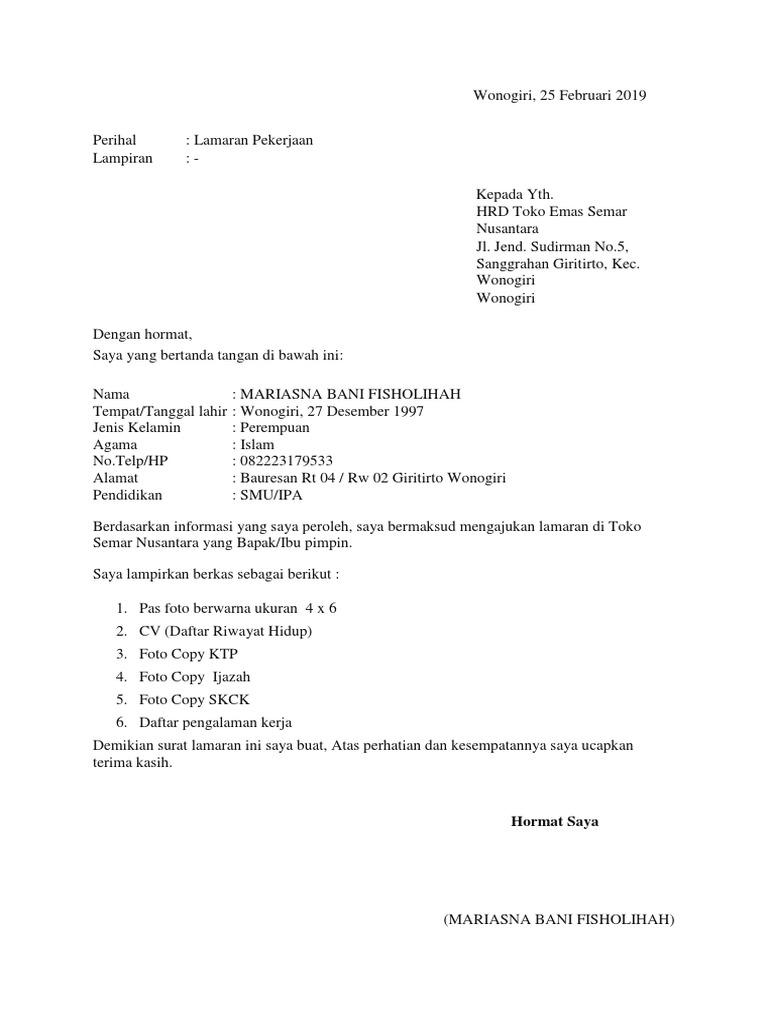 Contoh lamaran kerja di toko. Surat lamaran kerja adalah surat yang digunakan untuk melakukan permohonan mendapatkan pekerjaan sesuai pengalaman pada perusahaan tertentu. Contoh surat lamaran kerja di perusahaan seringkali dicari oleh para pencari kerja yang ingin mengajukan lamaran pekerjaan di perusahaan perusahaan yang ada di indonesia. Nah jika anda juga berencana melamar pekerjaan di perusahaan maka contoh surat lamaran kerja di persuahaan yang akan saya bagikan di bawah ini patut anda simak. Contoh surat lamaran kerja di toko untuk berbagai posisi sebuah usaha yang bergerak di bidang penjualan tentunya akan membutuhkan tenaga kerja yang mumpuni dalam pemasaran. Namun tidak hanya sebatas pemasaran pekerja bidang keuangan juga akan dibutuhkan untuk menganalisa keuntungan dan kerugian yang bisa terjadi dalam usaha tersebut. Pimpinan toko tas strawberry jalan raya karanganyar km 145 solo.