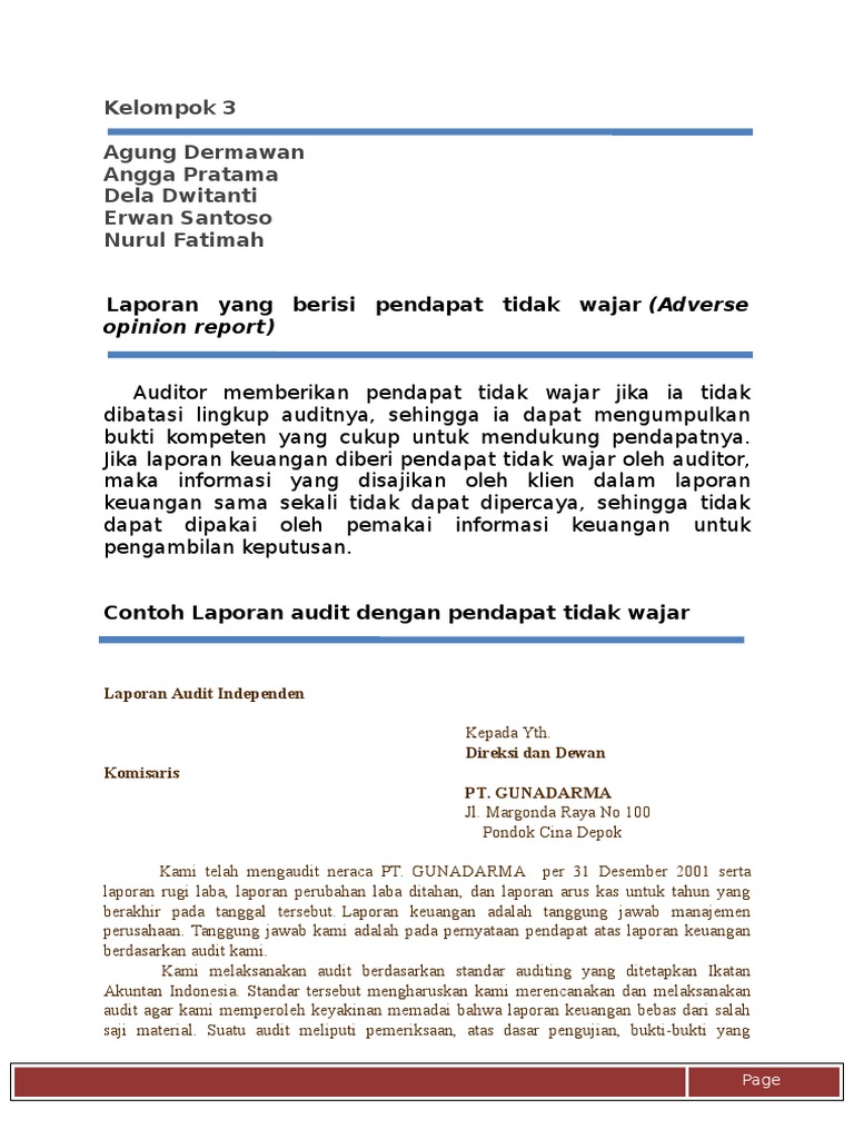 Margonda raya no 100 pondok cina depok. Serta penjelasan mengapa audit tidak memberikan pendapat bisa terjadi. Contoh laporan audit tidak memberikan pendapat akan disajikan pada artikel ini. Auditor tidak melaksanakan audit yang lingkupnya memadai untuk memungkinkannya memberikan pendapat atas laporan keuangan. Pendapat tidak wajar menyatakan bahwa laporan keuangan tidak menyajikan secara wajar posisi keuangan hasil usaha dan arus kas entitas tertentu sesuai dengan prinsip akuntansi yang berlaku umum di indonesia.