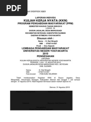 Contoh laporan kkn individu pdf. Contoh laporan akhir kkn kelompok pdf yang bisa bapakibu gunakan dan diunduh secara gratis dengan menekan tombol download biru dibawah ini. Adapun tujuan dari penyusunan laporan individu ini adalah untuk memenuhi salah satu pesyaratan dalam pelaksanaan kuliah kerja nyata alternatif fkip universitas mahasaraswati denpasar sebagai bahan evaluasi dan laporan tertulis yang memuat hasil kegiatan yang telah dillakukan mahasiswa kkn a selama kegiatan kkn dan memberi pengetahuan kepada seluruh warga sekolah smk nasional amlapura akan. Format laporan kkn kelompokindividu. Kecamatan seyegan kabupaten sleman. Kisi kisi ukg 2015 terbaru lengkap dari kemendikbud. Academiaedu is a platform for academics to share research papers.