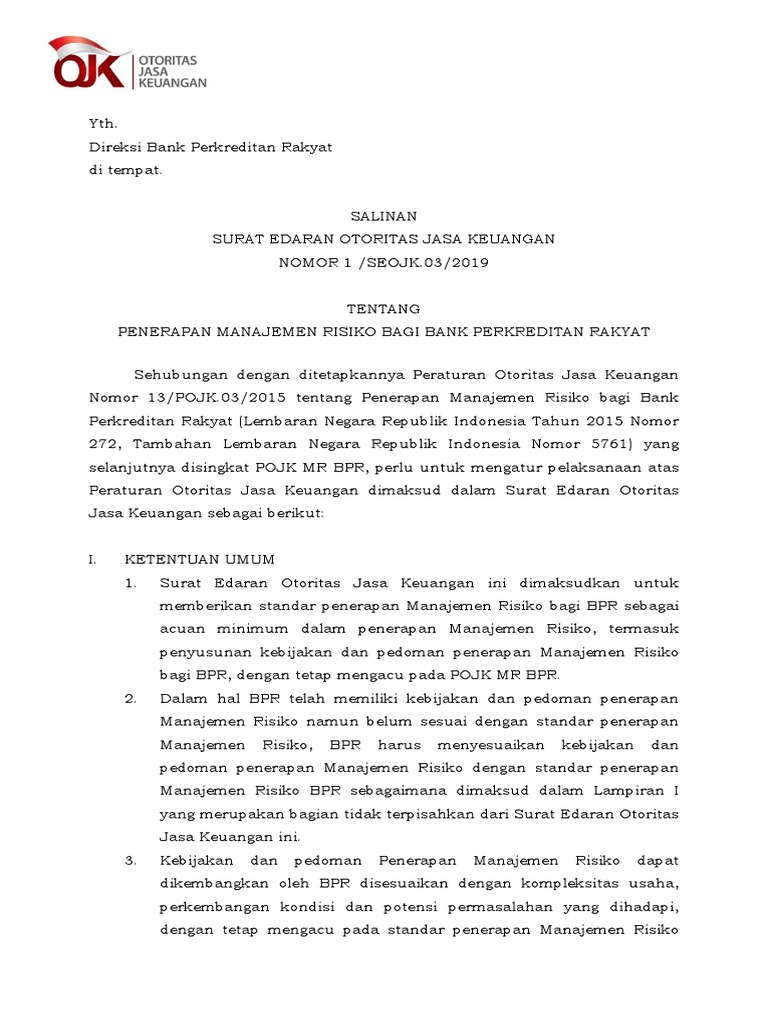 Di samping risiko suku bunga risiko kredit merupakan salah satu risiko utama dalam pelaksanaan pemberian kredit bank dan hal ini. Peraturan otoritas jasa keuangan nomor 13pojk032015 tentang penerapan manajemen risiko bpr. Komite manajemen risiko kmr kmr bertanggungjawab atas penerapan kerangka manajemen risiko secara keseluruhan. Proses untuk menyusun sop pembuatan laporan manajemen risiko tahunan hampir mirip dengan yang semesteran. Kita ketahui bahwa otoritas jasa keuangan telah menerbitkan peraturan nomor 13pojk032015 tentang penerapan manajemen risiko bagi bank perkreditan rakyat yang telah diundangkan tanggal 12 november 2015 yang mewajibkan bpr menerapkan manajemen risiko sesuai dengan kriteria sbb. Manajemen risiko dan kepatuhan pt bpr berlian bumi arta adalah bpr yang berdaya saing tinggi kami senantiasa berusaha untuk meningkatkan kepercayaan masyarakat.