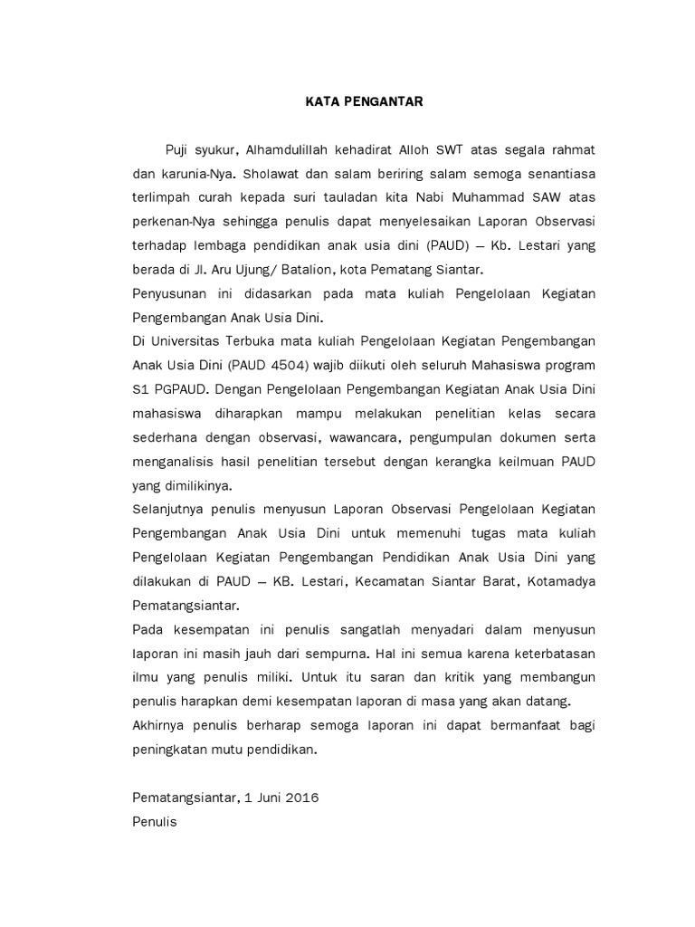 Contoh laporan observasi anak usia dini. Laporan hasil observasi ini diharapkan dapat menambah pengetahuan dan pengalaman yang nantinya akan penulis butuhkan dalam mempersiapkan diri menjadi seorang pengajar yang sudah mempunyai pengetahuan tentang anak usia dini. Serta sulitnya mengucapkan huruf r. Laporan perkembangan anak tahun ajaran 20152016 nama anak. Pendidikan anak usia dini. Sebagai penutup dari laporan ini penulis ingin mengucapkan terima kasih kepada pihak pihak yang membantu dalam. Tugas pendidik dan orang tua adalah mengoptimalkan tumbuh kembang di semua aspek perkembangannya yang meliputi bahasa kognitif fisik motorik nilai agama dan moral serta sosial emosional.