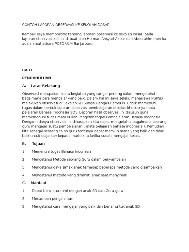 Contoh laporan observasi sekolah dasar. Inilah contoh laporan observasi anak autis pdf. Berikut ini adalah kisi kisi ukg 2015 terbaru lengkap dari kemendikbud yang merupakan kumpulan file dari berbagi sumber kisi kisi ukg 2015uji kompetensi guruukg 2015 tentang contoh laporan observasi anak autis pdf. Laporan observasi ini disusun selain untuk memenuhi tugas mandiri ada mata kuliah manajemen berbasis sekolah juga memberi wawasan dan pengetahuan baru bagi kami agar kami mengetahui bagaimana upaya upaya meningkatkan lulusan yang baik dan maksimal di sd. Laporan observasi pembelajaran di sekolah. Di mana dalam pelaksanaan observasi saya mendapat tambahan pengetahuan pemahaman dan keterampilan mengenai bagaimana pelaksanaan pembelajaran kelas rangkap di sd. Dalam hal ini saya selaku mahasiswa pendidikan teknik mesin melakukan observasi di smkn 4 semarang untuk memenuhi tugas dalam bentuk laporan observasi pembelajaran di kelas.