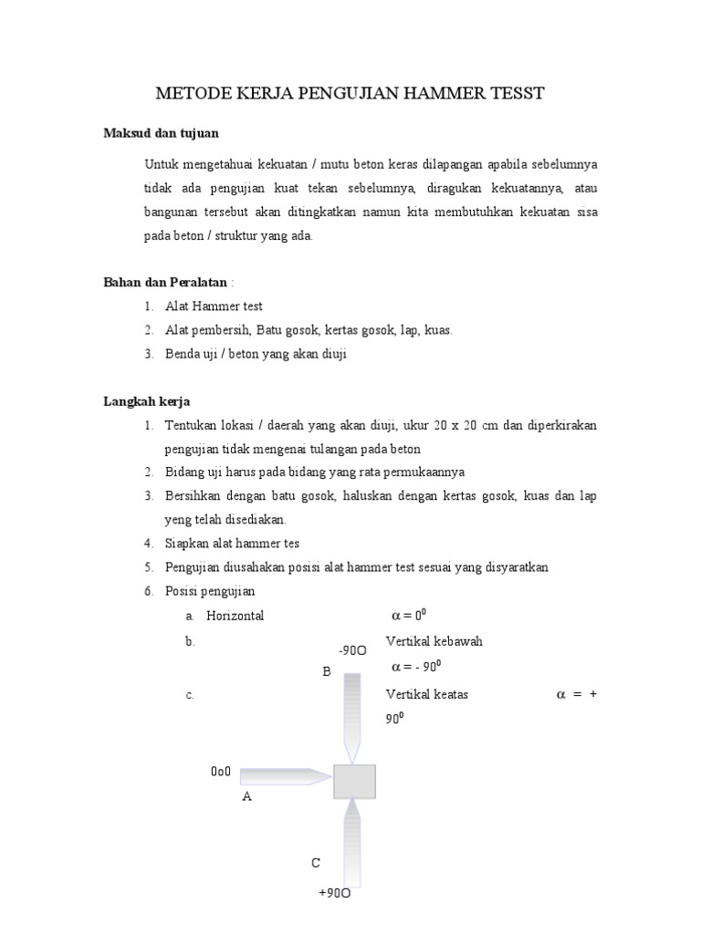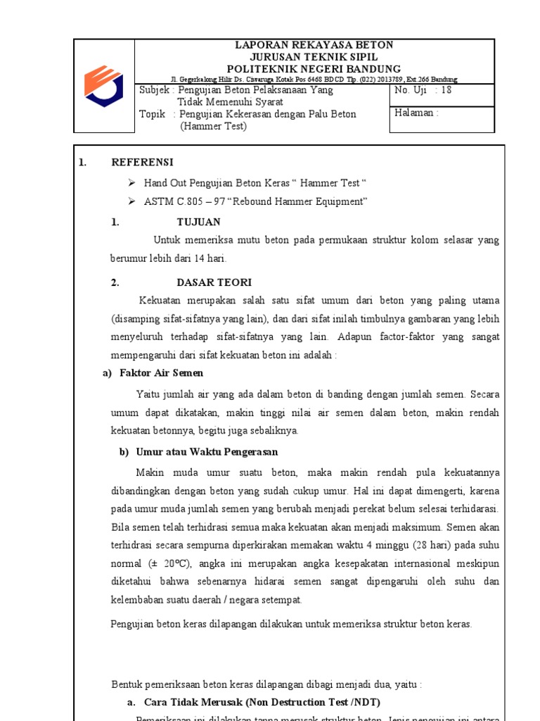 Contoh laporan pengujian hammer test. Contoh addendum tambah kurang suatu pekerjaan. Cara menggunakan hammer test alat uji beton rencanakan pengujian beton. Lakukan hammer test pada kolom tersebut sebanyak 6 kali test. Concrete hammer test atau schmidt hammer test merupakan suatu metode uji yang mudah dan praktis untuk memperkirakan mutu beton. Disamping itu dengan menggunakan metode ini akan diperoleh cukup banyak data dalam waktu yang relatif singkat dengan biaya yang murah. Setelah dilakukan pengujian dengan menggunakan hammer test diperoleh mutu beton struktur kolom di selasar depan lab.
