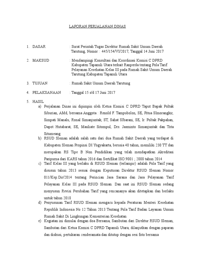 Selasa 23 november 2010 pukul. Tugas kerja tersebut bisa berupa study banding audit ke perusahaan cabang rapat kerja nasional maupun pekerjaan pekerjaan lain yang dilakukan di luar kota tidak di lingkungan kantor sendiri. Laporan hasil perjalanan dinas dalam rangka koordinasi dan evaluasi penyiapan penempatan dan perlindungan dokumen ctkitki keluar negeri pada dinas tenaga kerjatransmigrasi dan sosial kabhulu sungai tengah di barabai kalimantan selatan i. Demikian harap saudara melakasankan dan kami mohon bantuan semua pihak guna kelancaran pelaksanaan perjalanan dinas tersebut. Lebih lanjut perjalanan dinas merupakan perjalanan keluar tempat kedudukan yang dilakukan melewati batas kota danatau dalam kota dari tempat. 1100 selesai tempat.