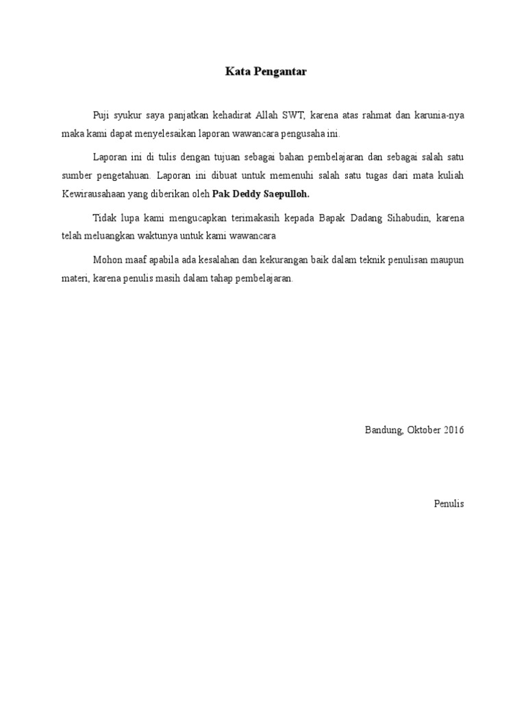 Contoh laporan kewirausahaan laporan kewirausahaan ini adalah awal dari pembelajaran kita untuk membuat sebuah laporan hasil dari jualan suatu produk supaya jelas dari hasil usaha yang dijalankan maka dibuatlah suatu laporan kewirausahaan. Kami berupaya semoga laporan ini sesuai dengan harapan pembaca. Terima kasih untuk ibu nina yang sudah bersedia menjadi narasumber dan tokoh inspiratif kita. Entah itu narasumber. Biasanya wawancara dilakukan dengan mengajukan beberapa pertanyaan seputar bidang yang dikuasai oleh narasumber tersebut. Dalam tugas untuk memenuhi mata kuliah kewirausahaan ini kami.