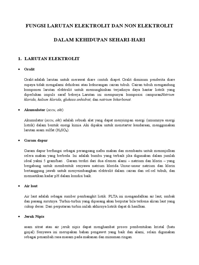 Elektrolit adalah suatu zat yang larut atau terurai ke dalam bentuk ion ion dan selanjutnya larutan menjadi konduktor elektrik ion ion merupakan atom atom bermuatan elektrik. Semua proses kehidupan berlangsung di dalam cairan tubuh. Macam macam larutan elektrolit berdasarkan ikatannya. 10 contoh larutan elektrolit dan non elektrolit dalam kehidupan sehari hari. Contoh reaksi larutan non elektrolit. Elektrolit bisa berupa air asam.