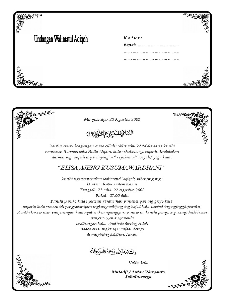 Contoh surat undangan pernikahan contoh 1. Contoh layang undangan dalam bahasa jawa contoh isi undangan. Informasi undangan yang kami bagikan semoga menjadi informasi terbaik dan bisa benrmanfaat untuk semua khususnya informasi tentang layang ulem bahasa jawa rapat osis terbaru 2019 yang semuanya kami kumpulkan dengan serapih mungkin. Sama seperti lainya surat di bagi menjadi berbagai jenis ada surat pribadi resmi surat untuk pernikahan surat khitanan dan lainya. Dan nyari di internet nya itu susah banget. Bismillahirrohmaanirrohim assalaamu alaikum wr.